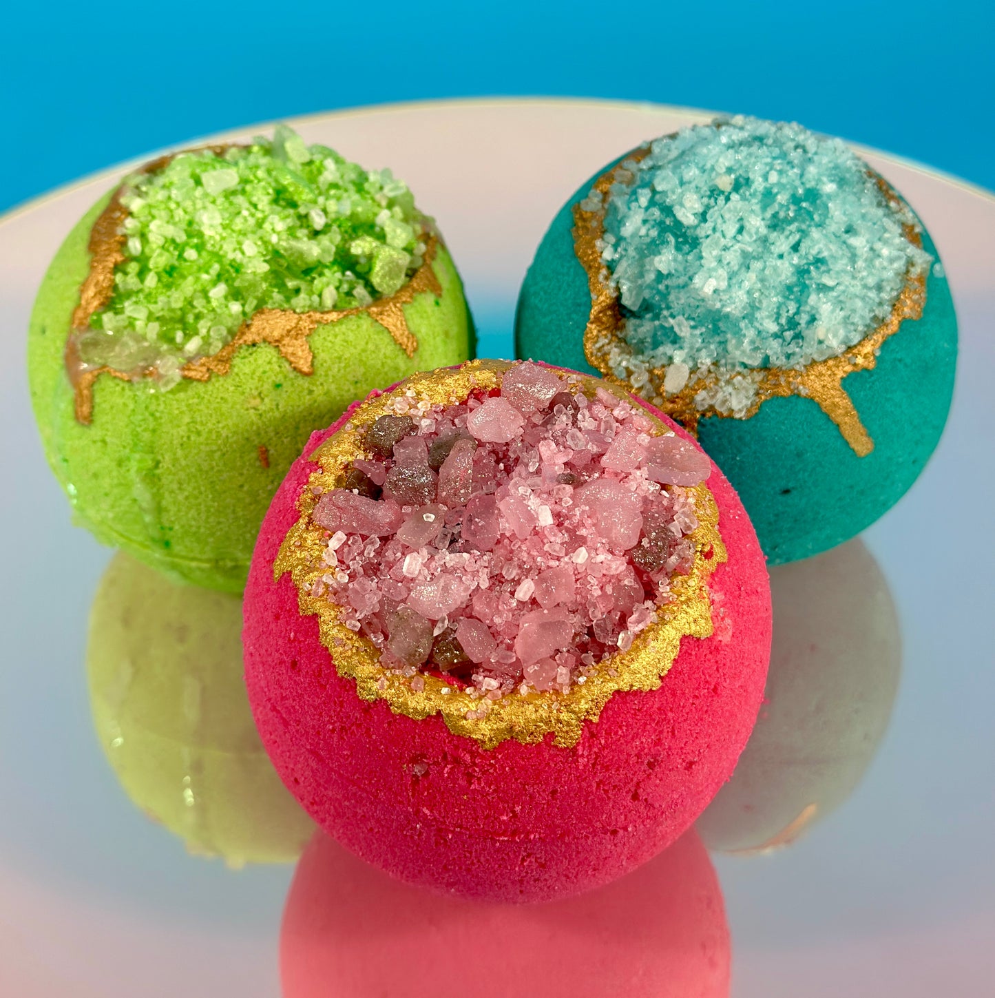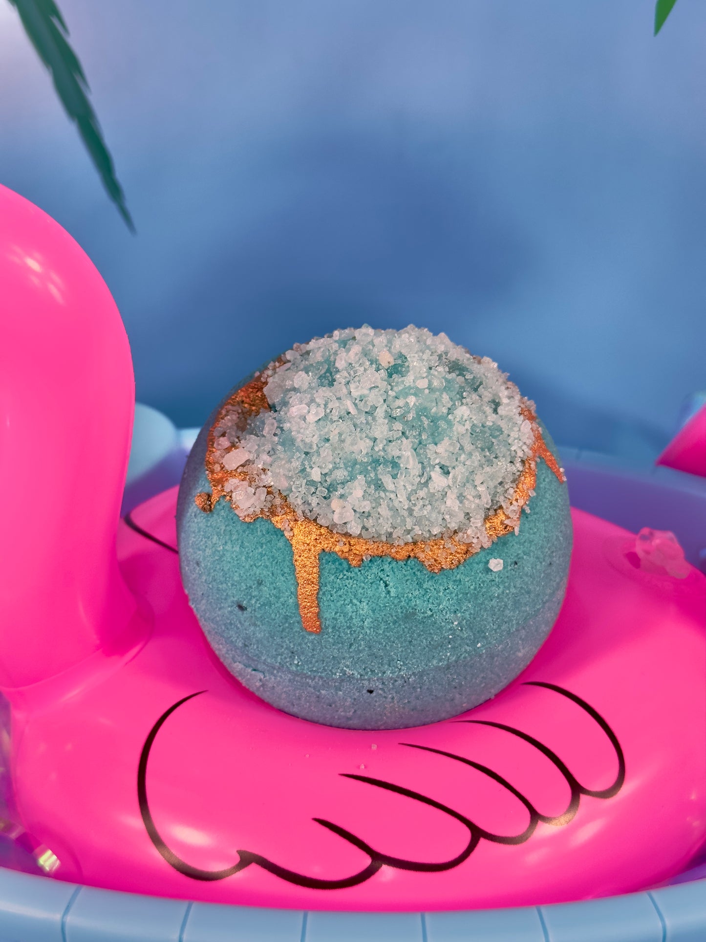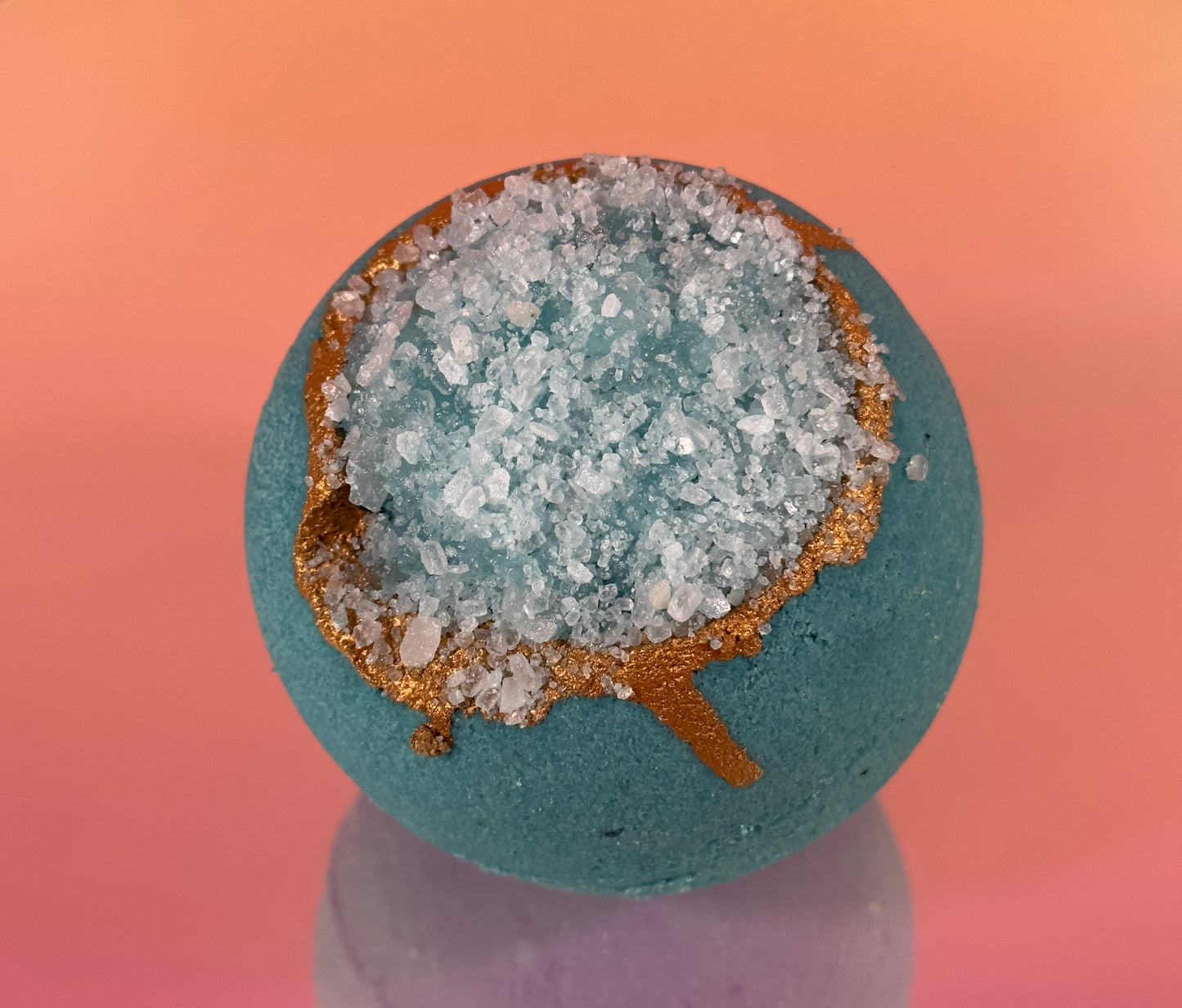Looks like: Deep turquoise round geode-inspired bath bomb topped with epsom salts and rock salt to simulate the crystallization found in natural geode rocks.