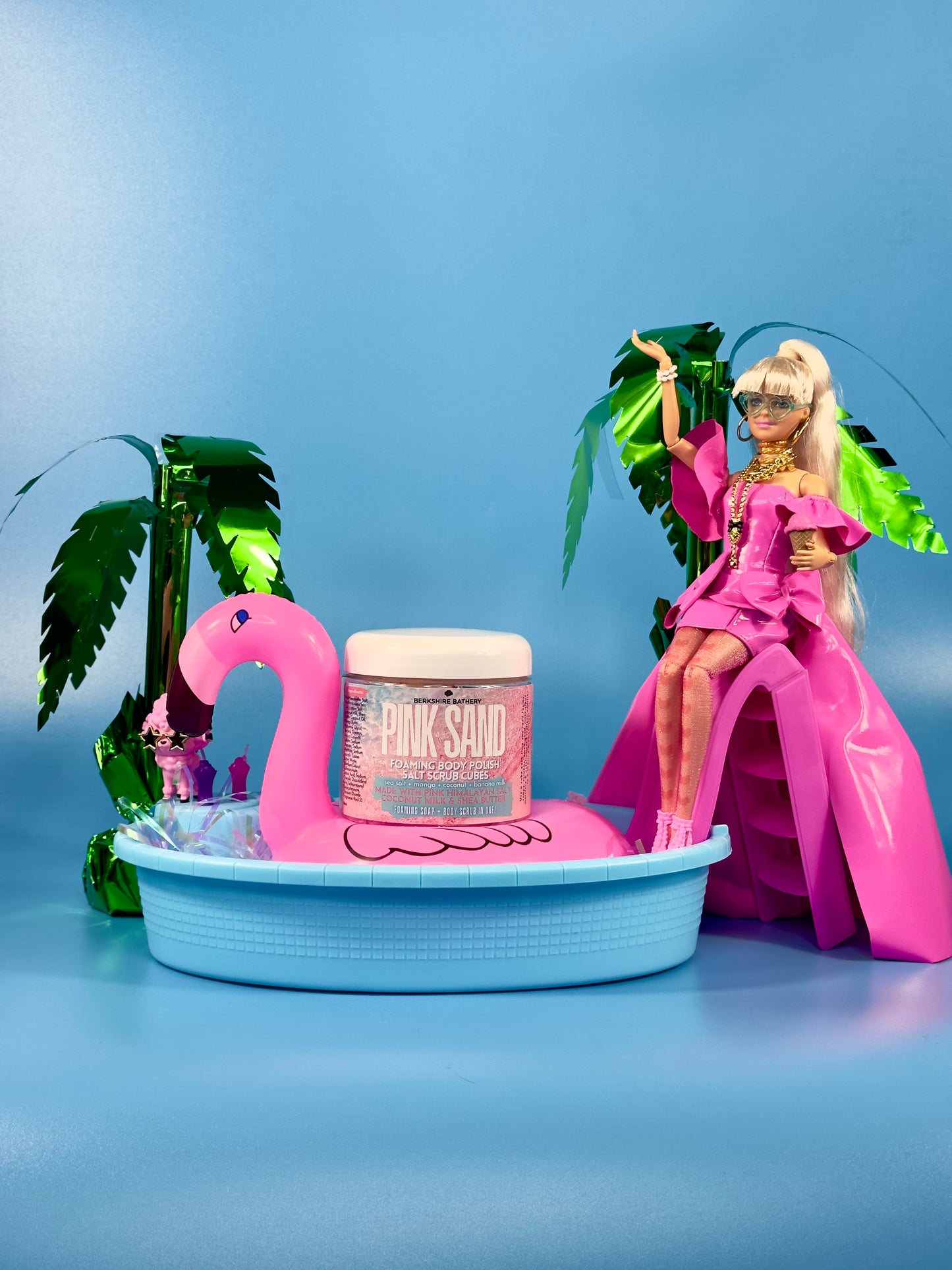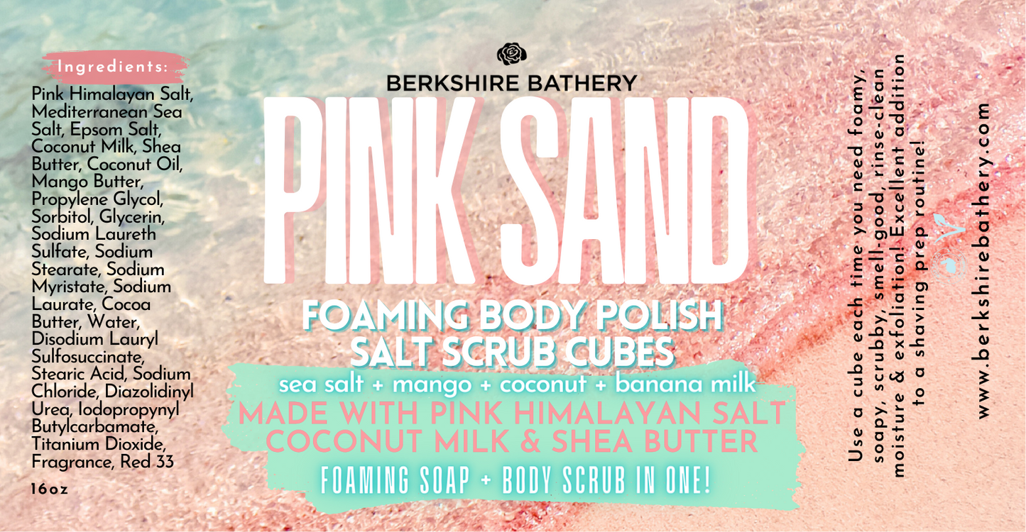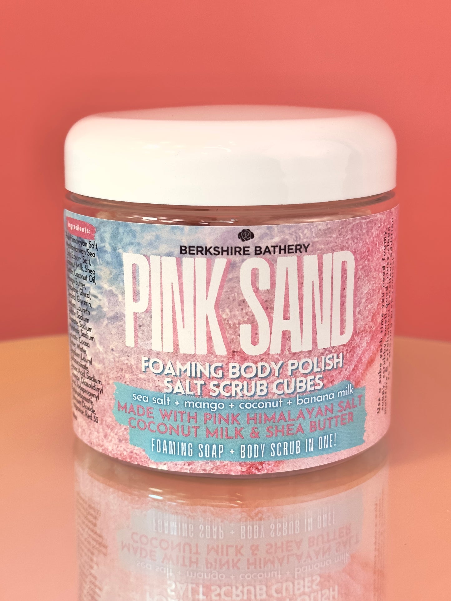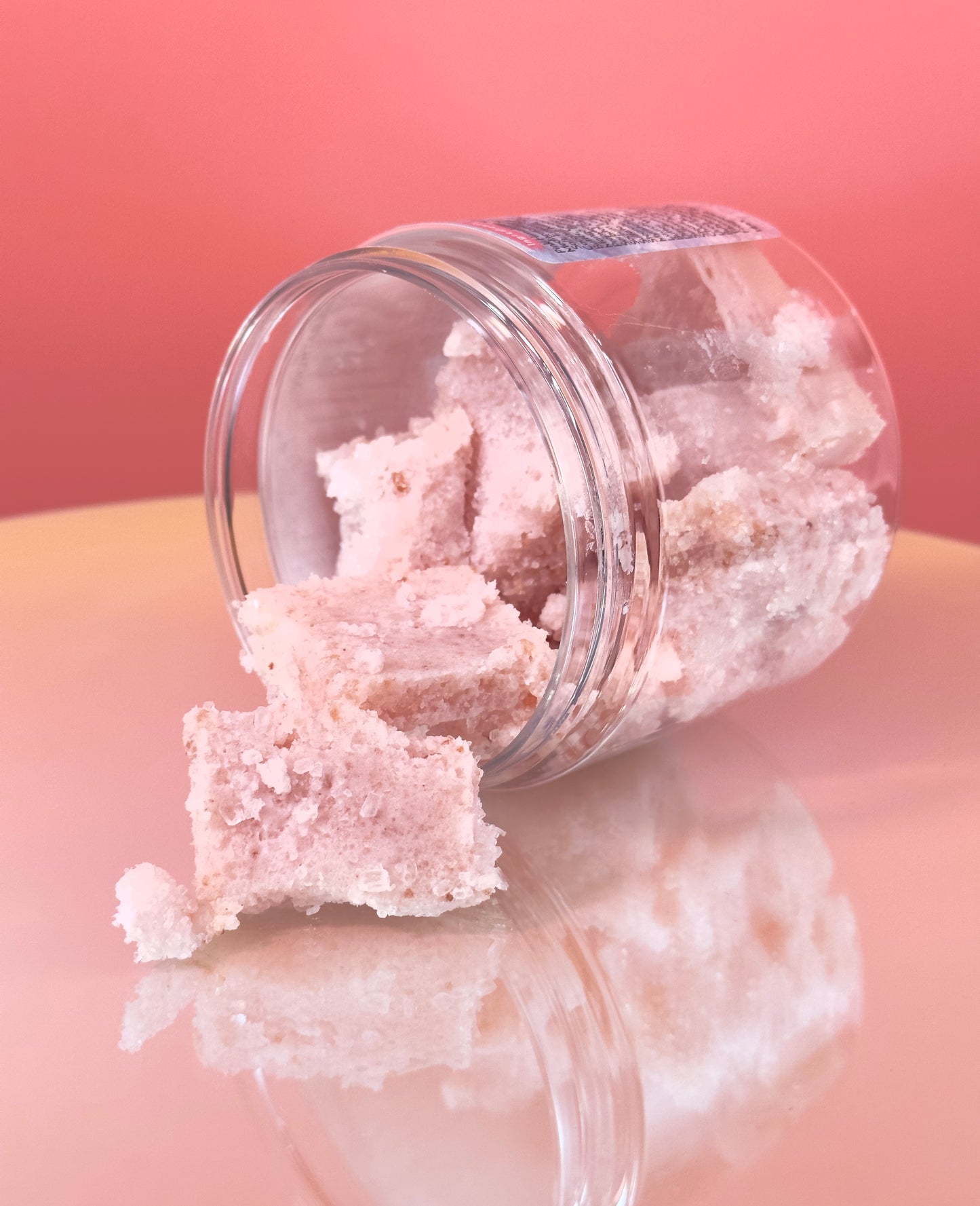 Looks like: Clear tub with white screw-top lid filled with pink soft semi-solid scrub cubes made of polishing salts and foaming bath soap.