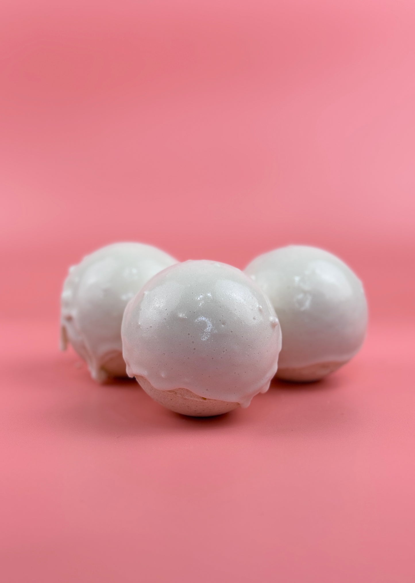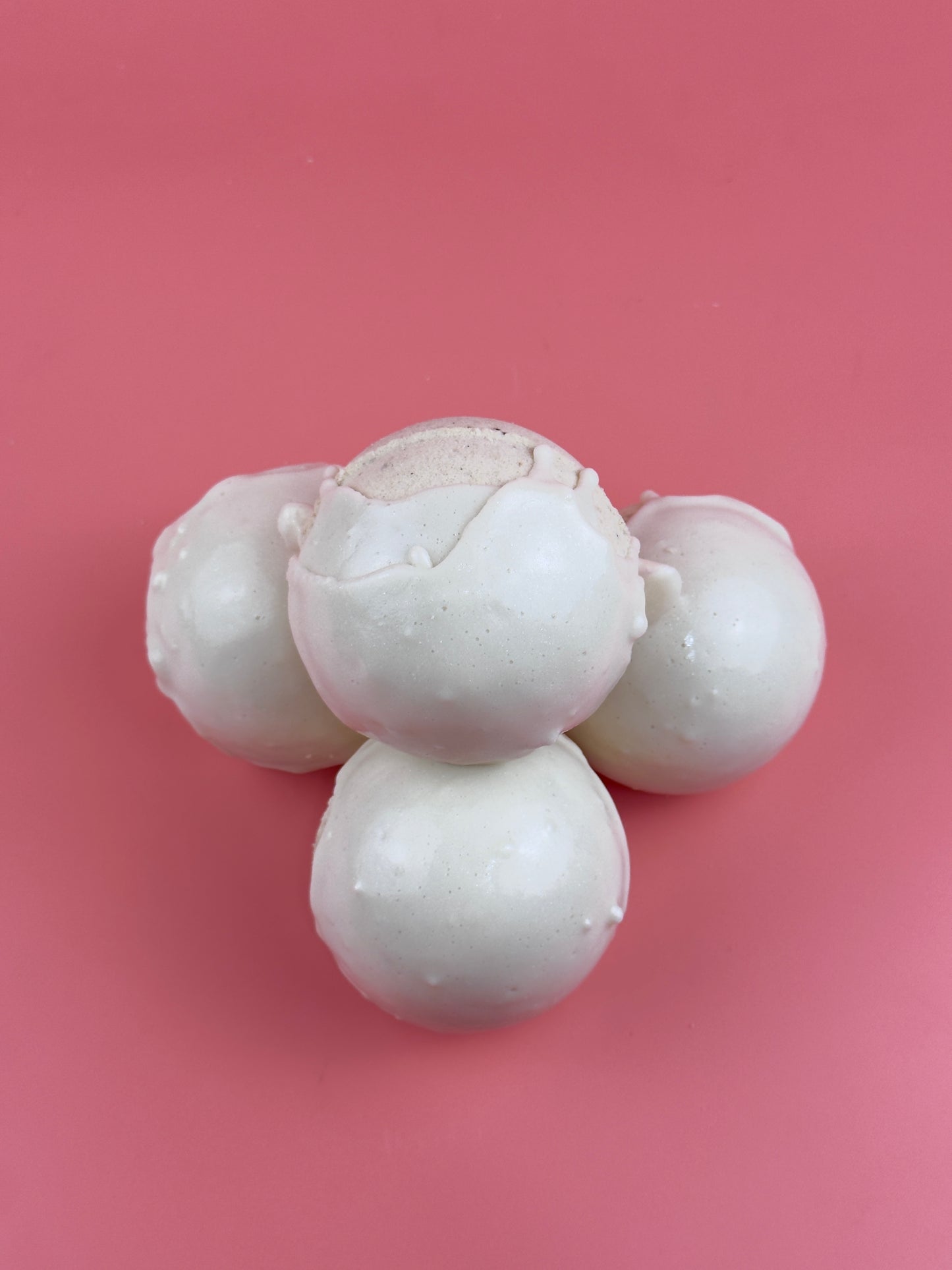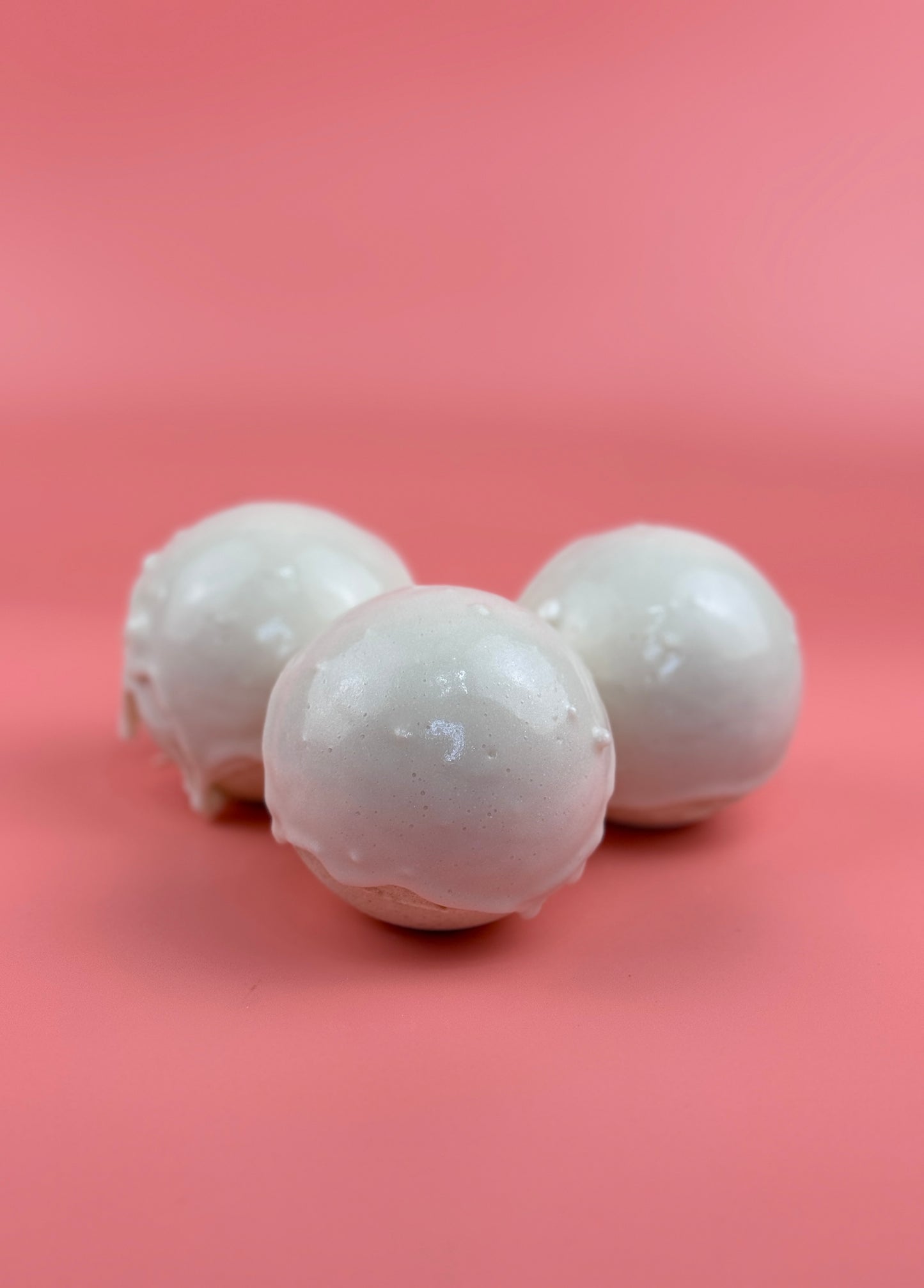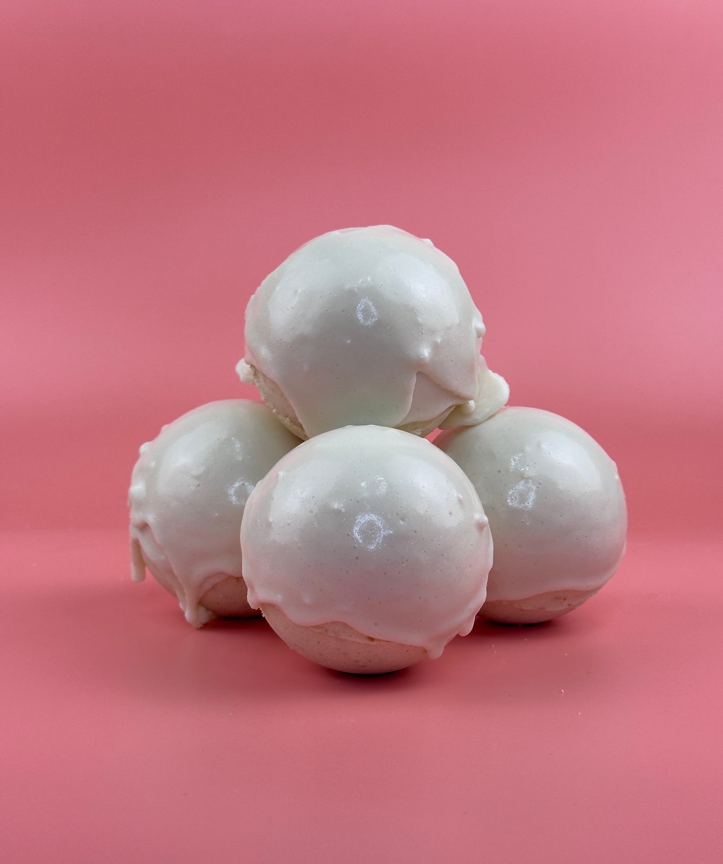 Looks like: A creamy white snowball milk bath bomb dipped in sparkly white chocolate cocoa butter drizzle