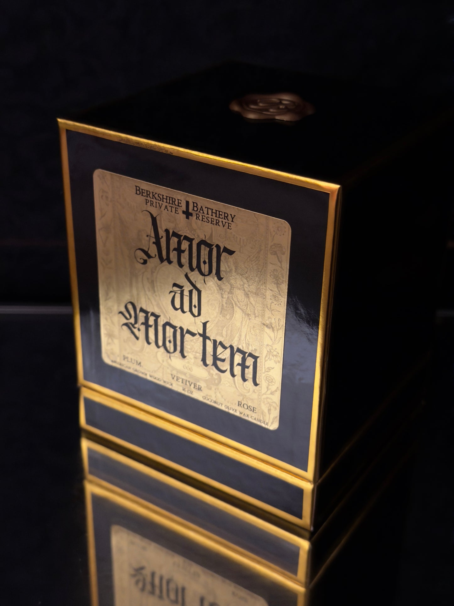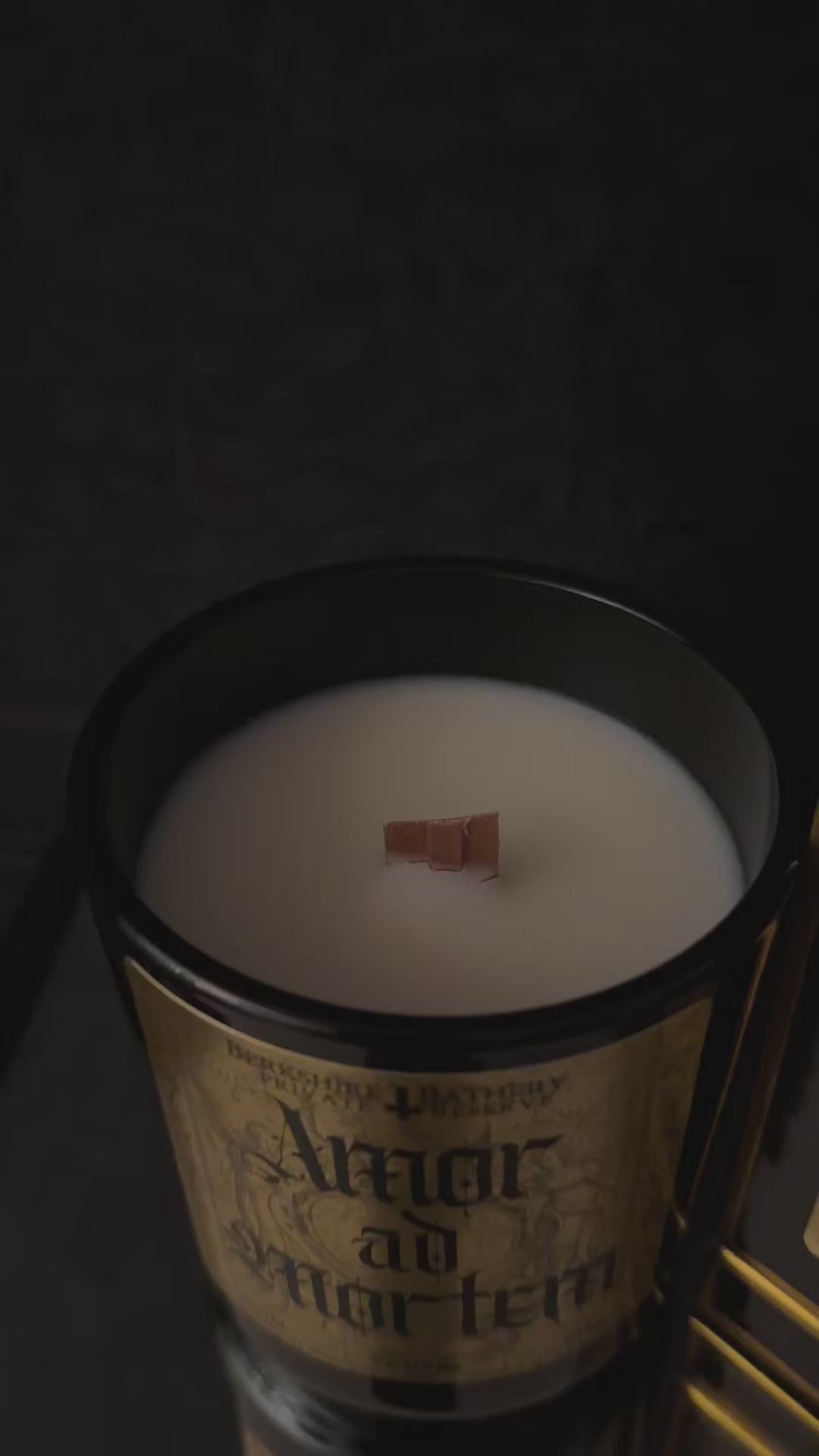 Glossy black glass vessel displaying a gold metallic label (featuring my original gothic artwork designed and printed by hand), creamy coconut olive oil soy wax nestled around a crackling American-grown wooden wick. Comes in a matching black and gold gift two-piece nested box for maximum opulence -- perfect for gift giving.