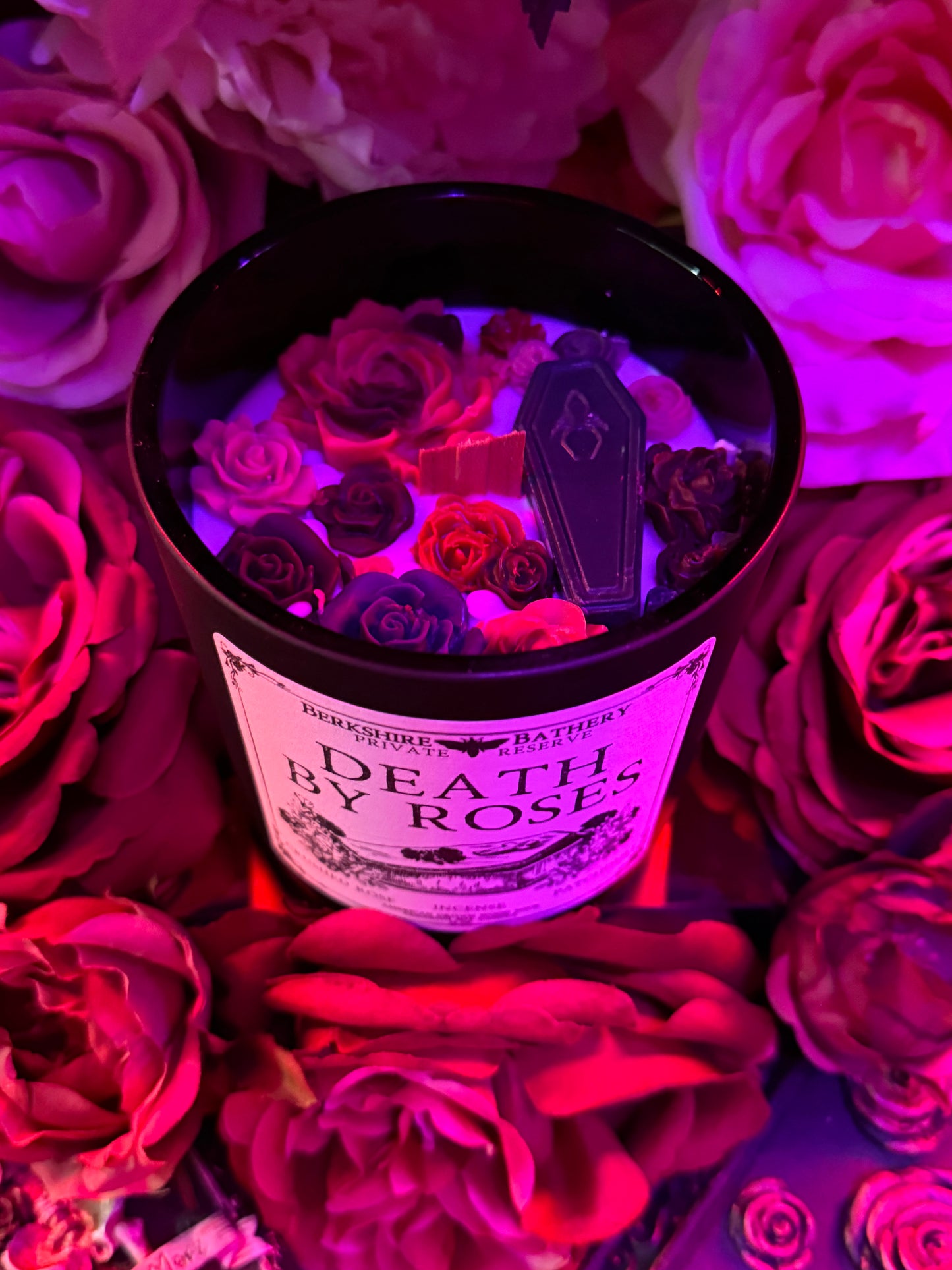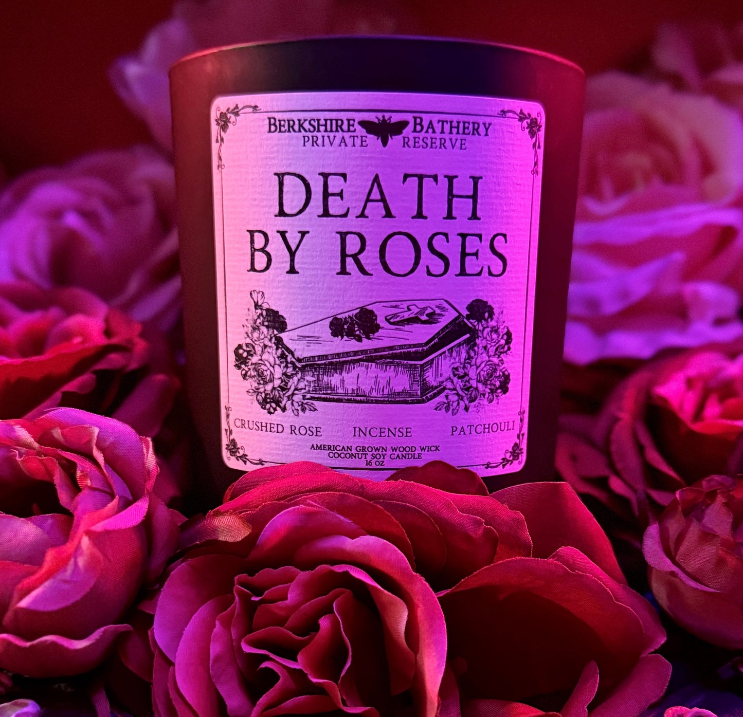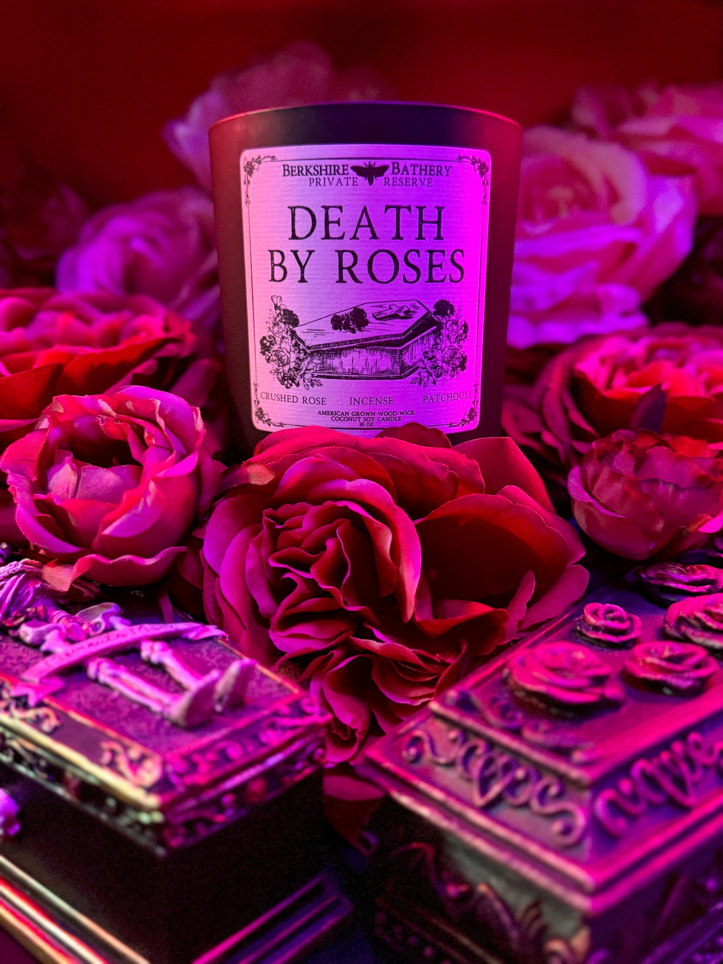 Matte black glass vessel displaying an ivory textured vintage style label (featuring my original artwork designed and printed by hand), creamy coconut olive oil soy wax nestled around a crackling wooden wick, topped with decorative wax roses and coffin.
