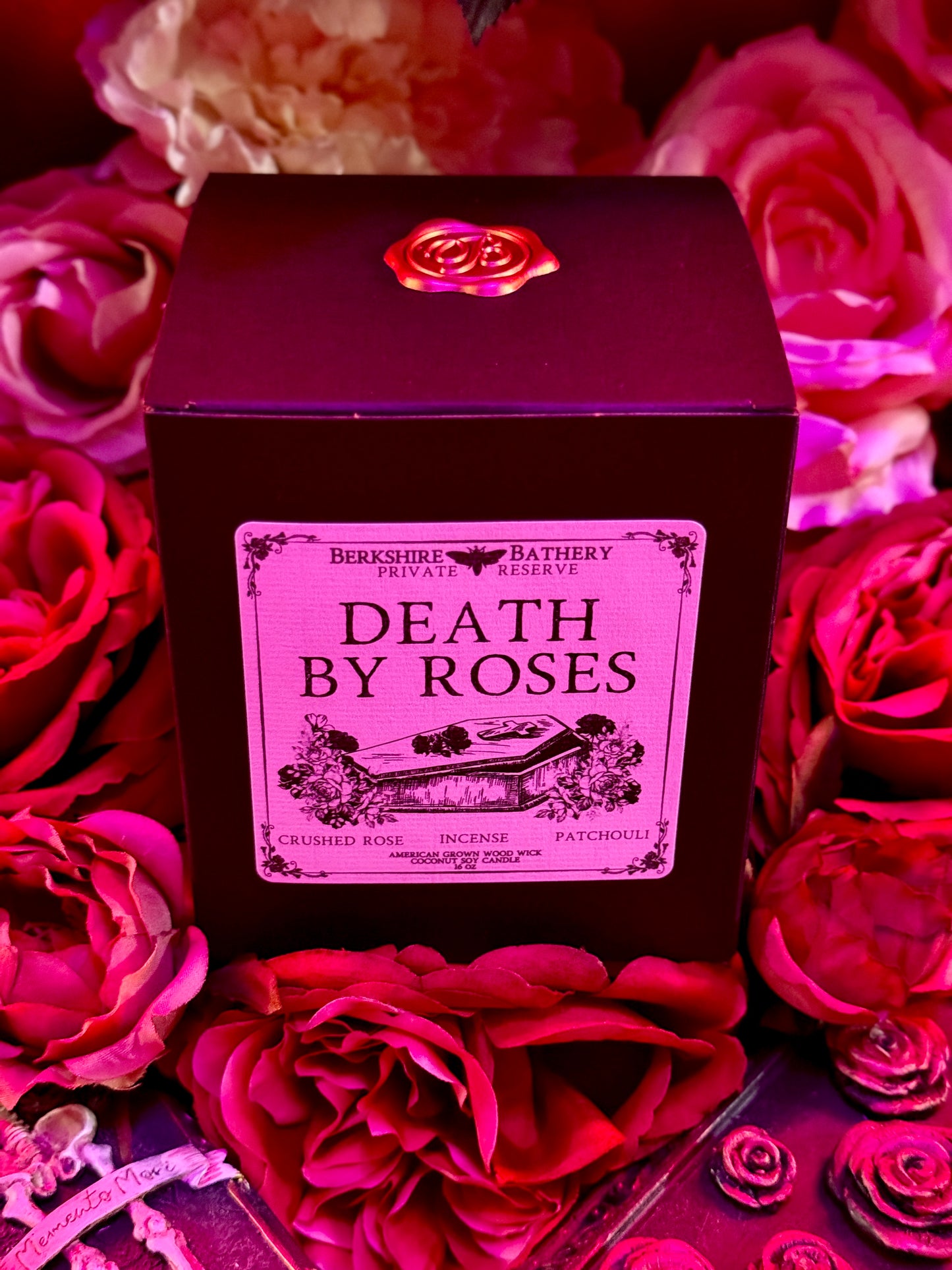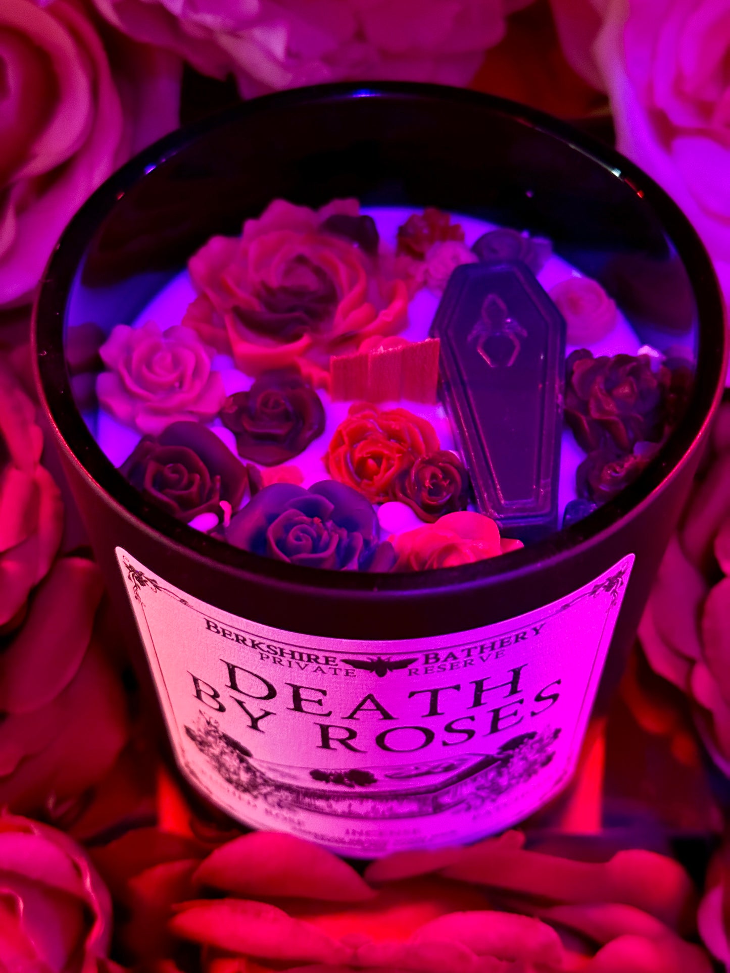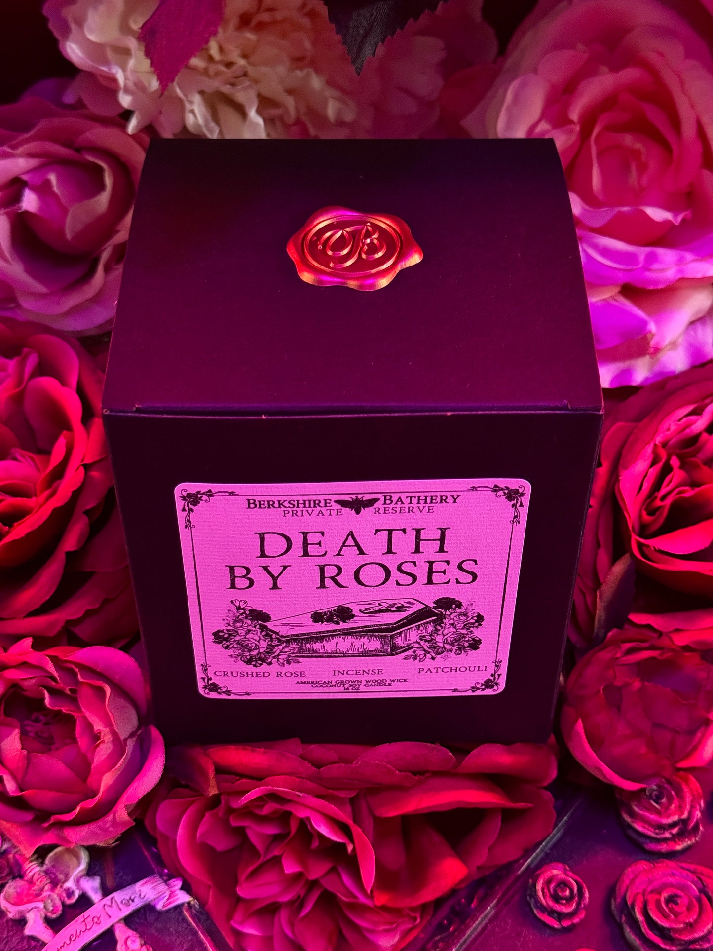 Matte black glass vessel displaying an ivory textured vintage style label (featuring my original artwork designed and printed by hand), creamy coconut olive oil soy wax nestled around a crackling wooden wick, topped with decorative wax roses and coffin.