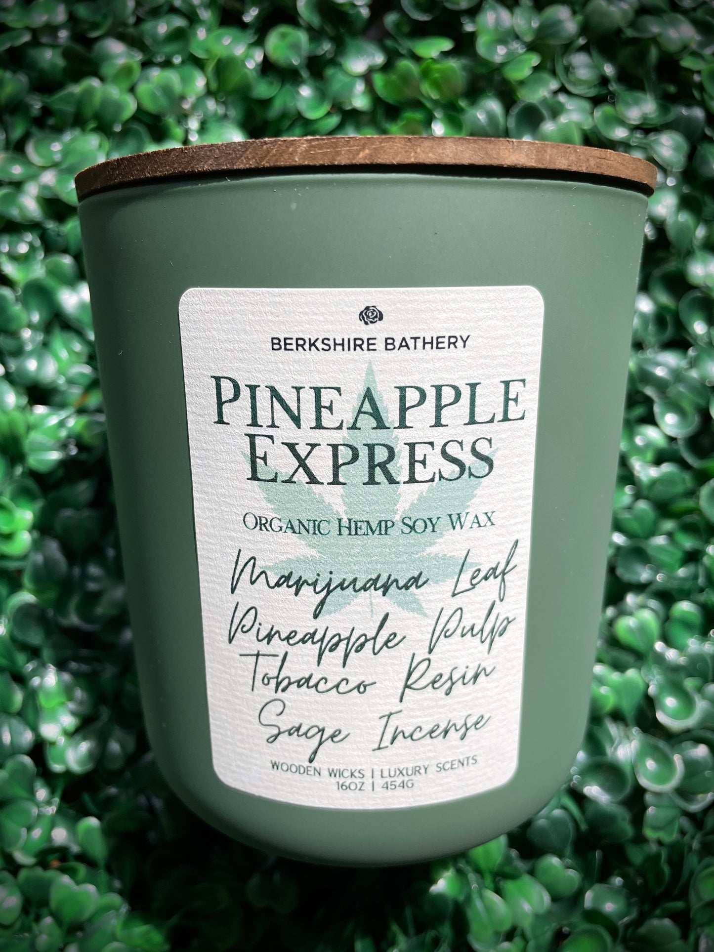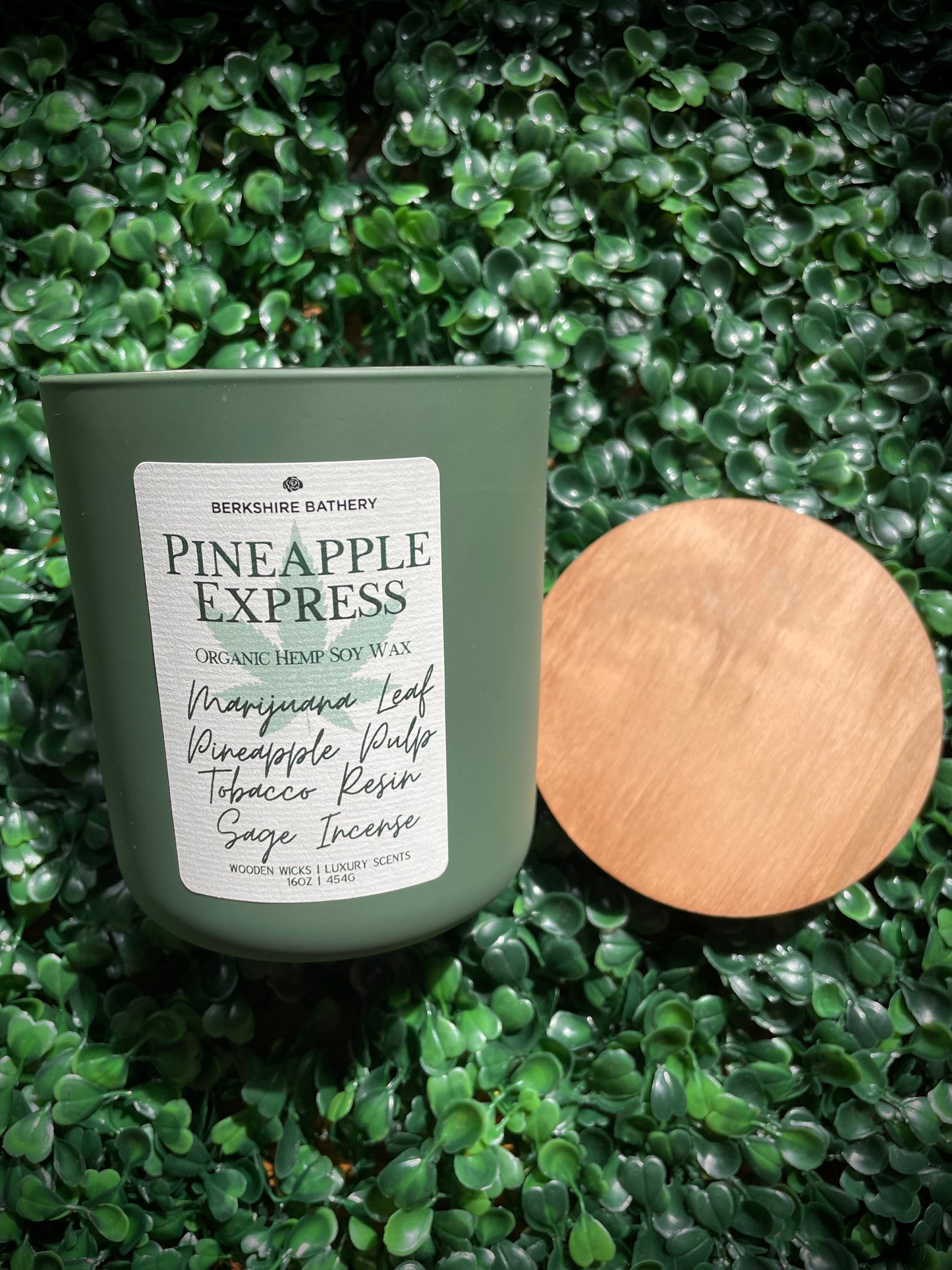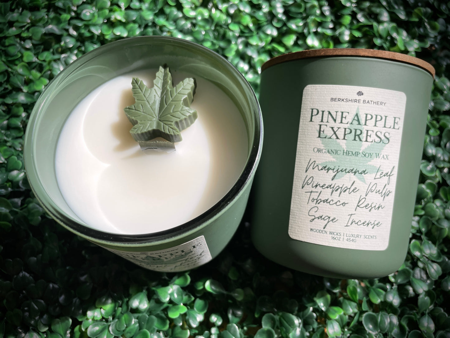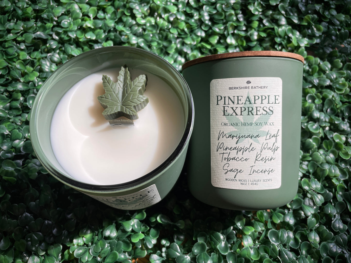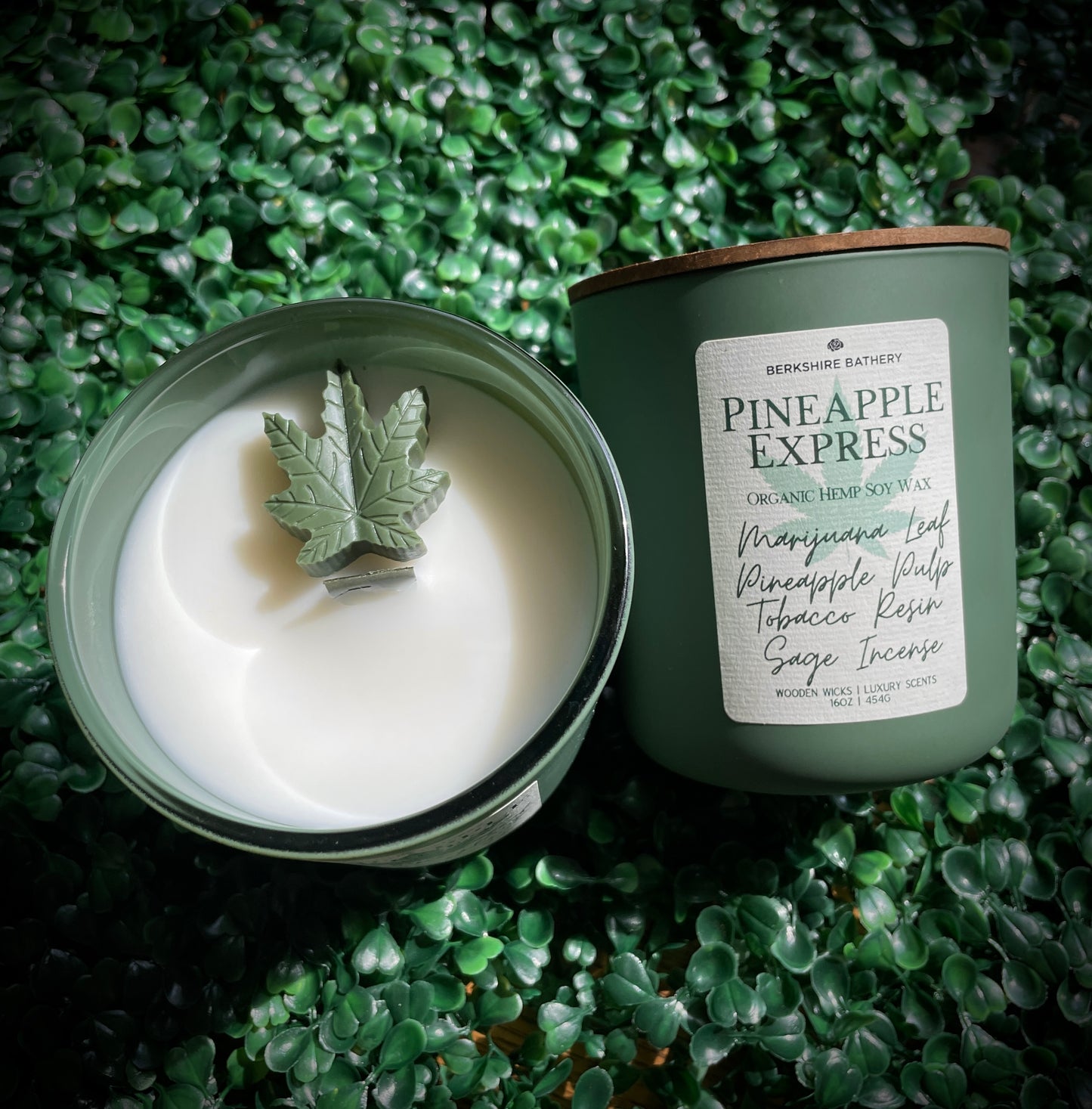 Berkshire Bathery presents this 16oz wooden wick HEMP soy wax candle scented in notes of marijuana leaf, marijuana, hemp seeds, musk, amber, eastern cedar, cannabis flower, gardenia, tobacco leaf, smoke, palo santo, sandalwood, pineapple, sage, palm leaf, anise, sage, sugar
