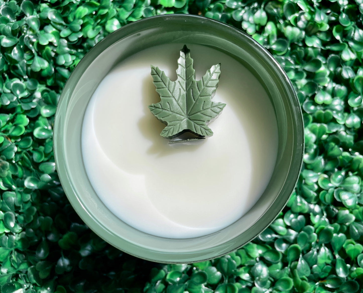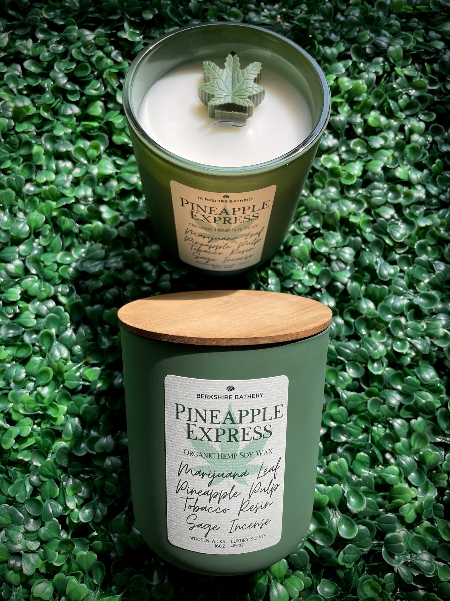 Featuring a new HEMP green-colored, all-natural, American-made wood wick surrounded by 16 ounces of silky smooth organic HEMP soy wax scented just like that good good pineapple express kush you know and love! Topped with a HEMP soy wax marijuana leaf for the perfect added touch, this emerald green matte glass candle is crowned with an ultra luxe wooden lid to complete the earthy, all natural plant look.
