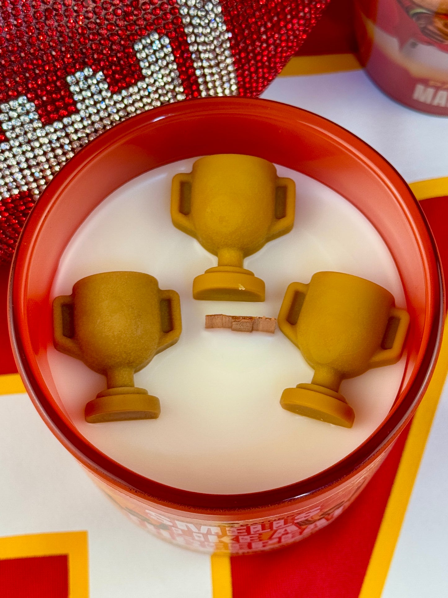 Matte CHIEFS vermillion red glass vessel displaying a celebratory football themed label (featuring my original artwork designed and printed by hand), creamy coconut olive oil soy wax nestled around an American-grown wooden wick that crackles like a fireplace!