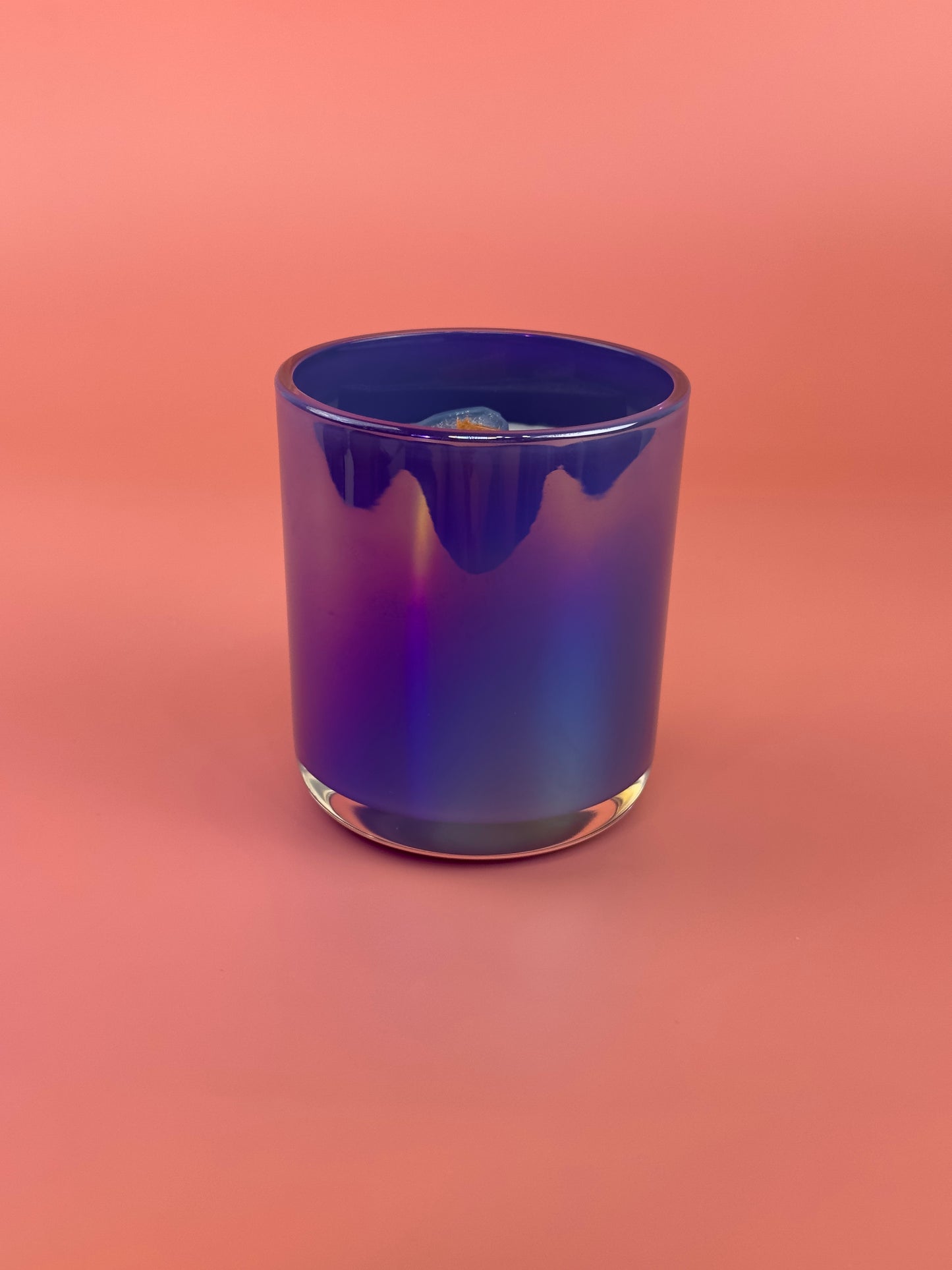 Looks like: Holographic oil slick blue glass vessel + holographic metal lid + matching holographic label