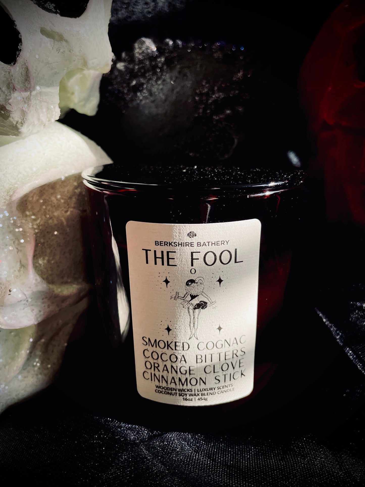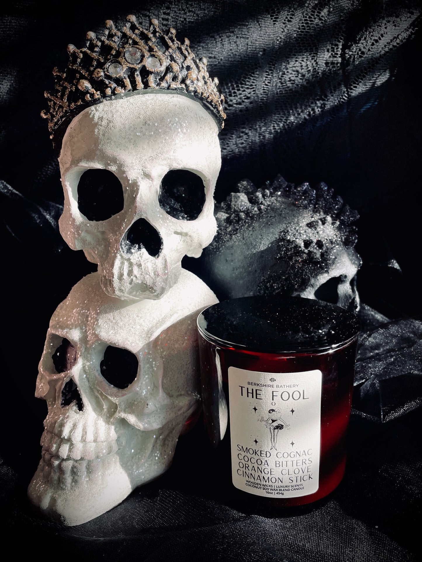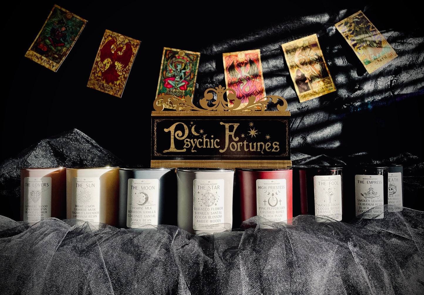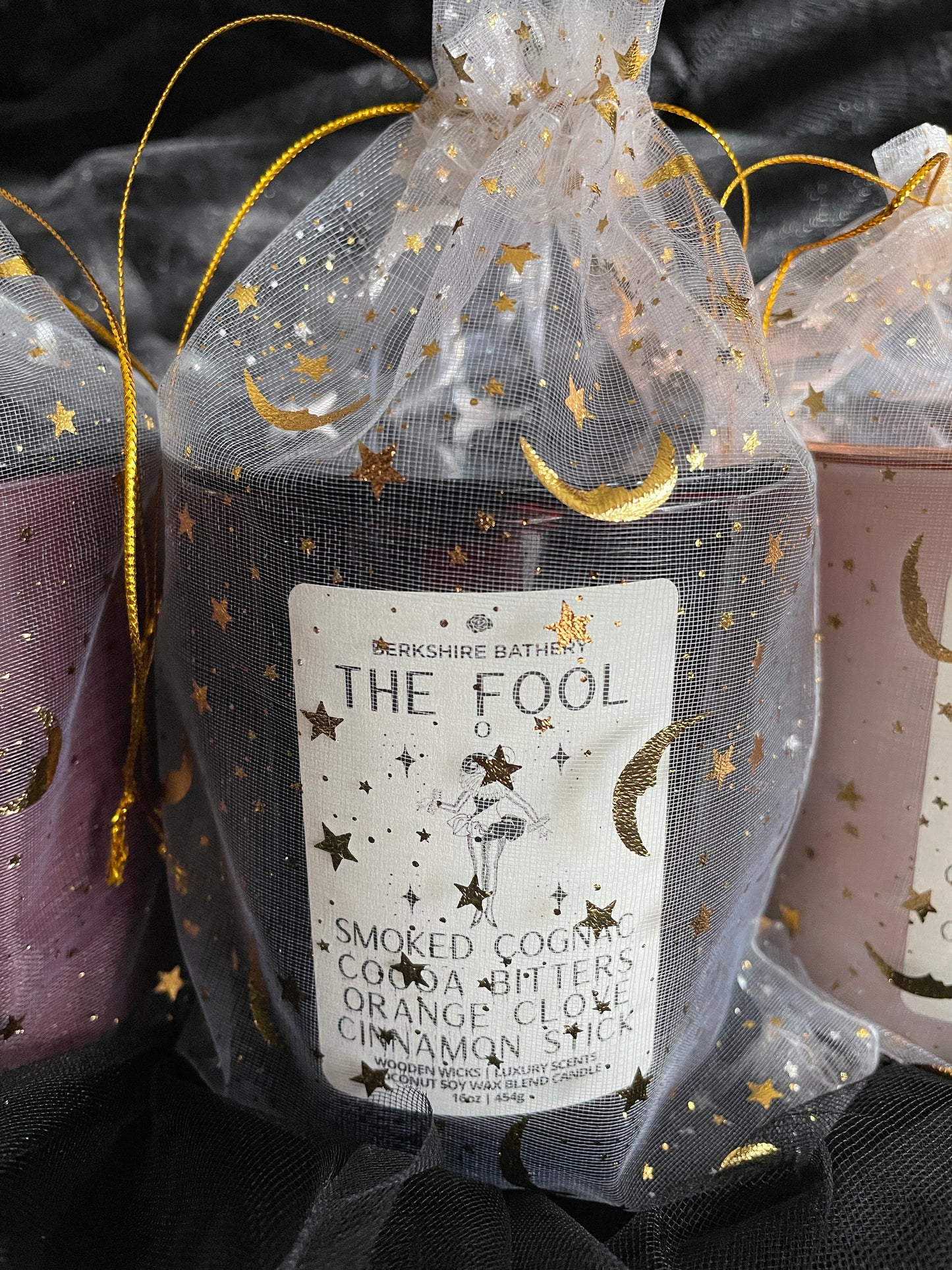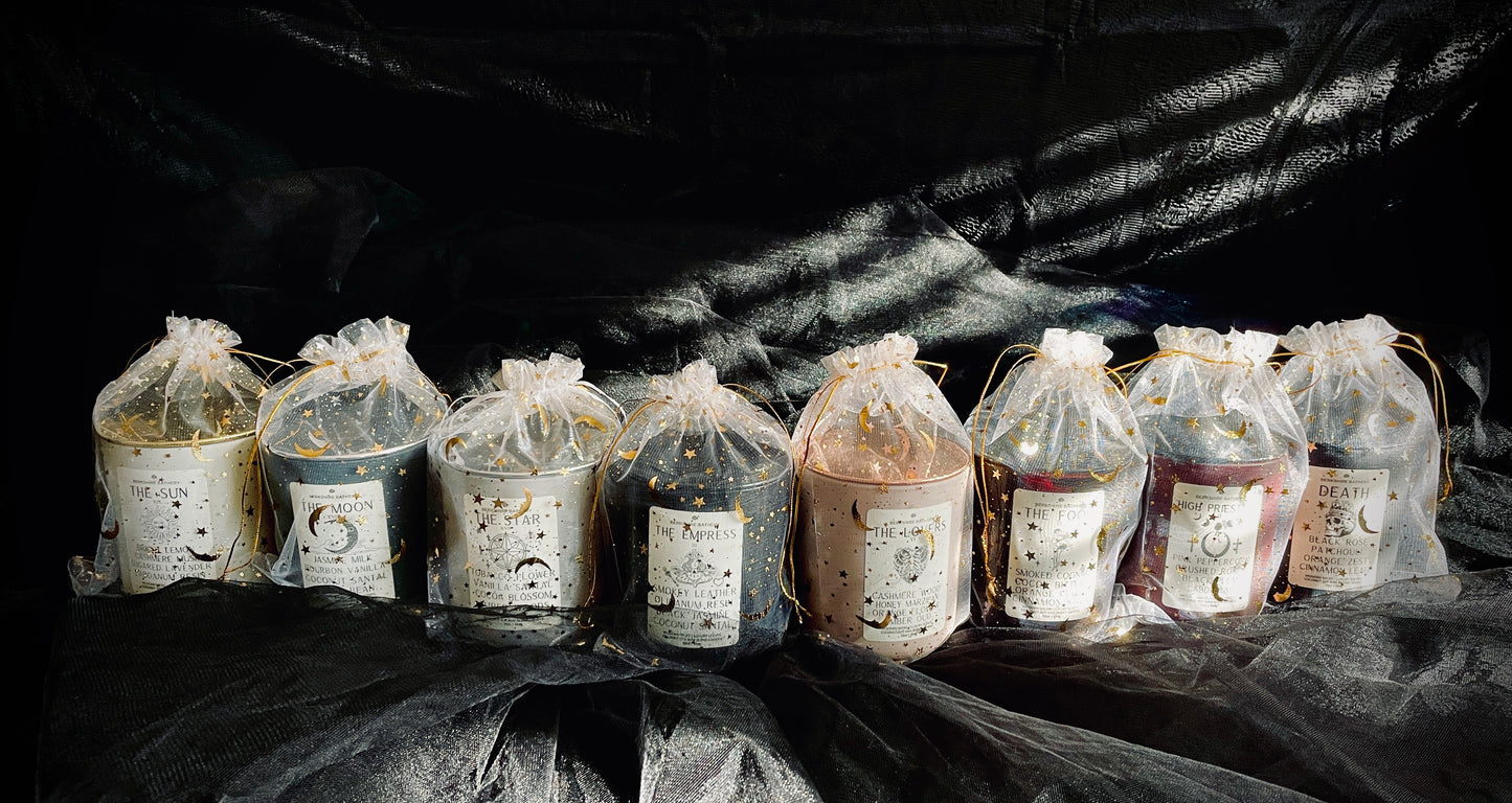 Each Tarot inspired candle comes packaged in a sheer celestial sachet drawstring bag designed in a gold crescent moon, clouds, and stars print.