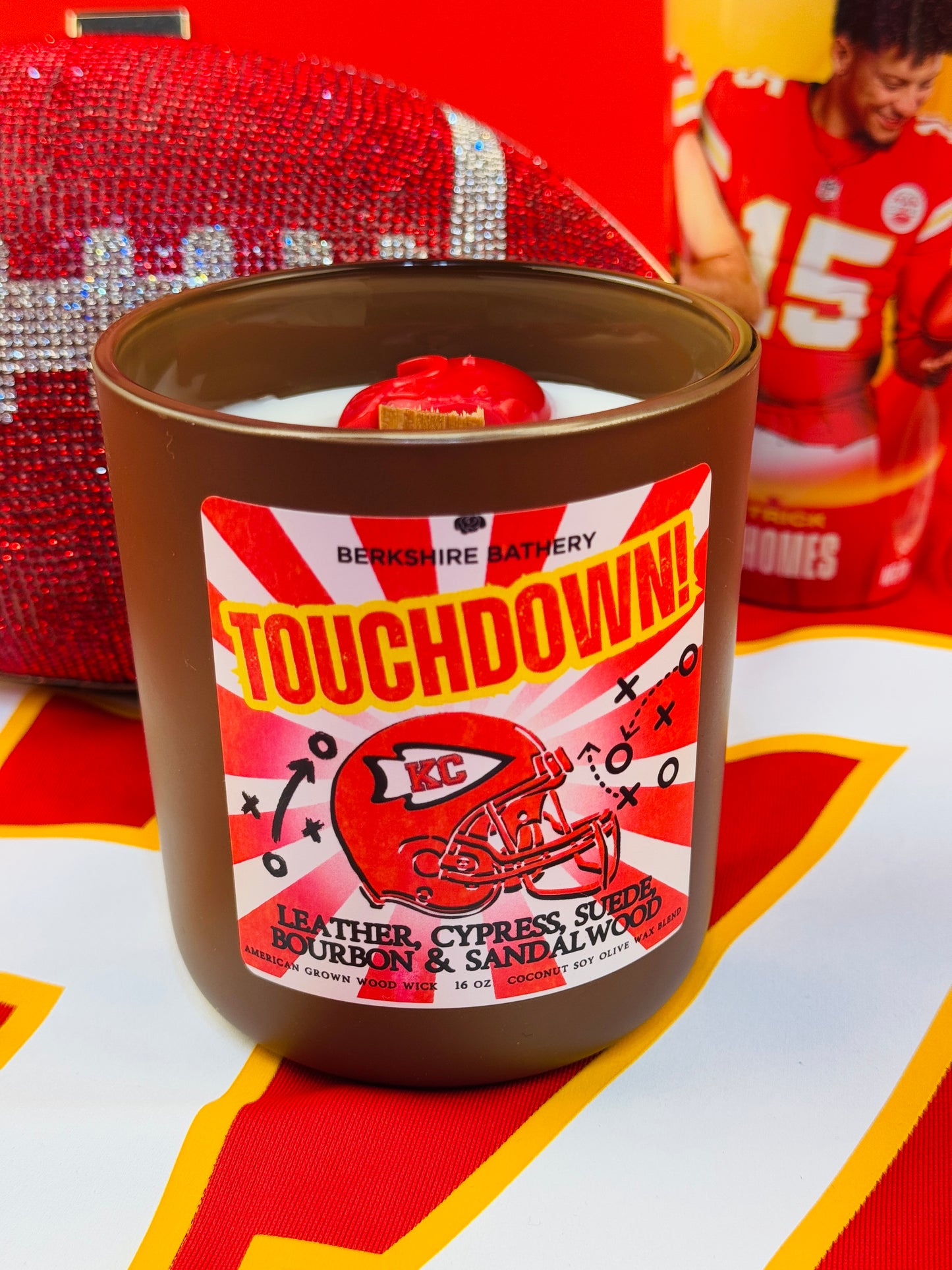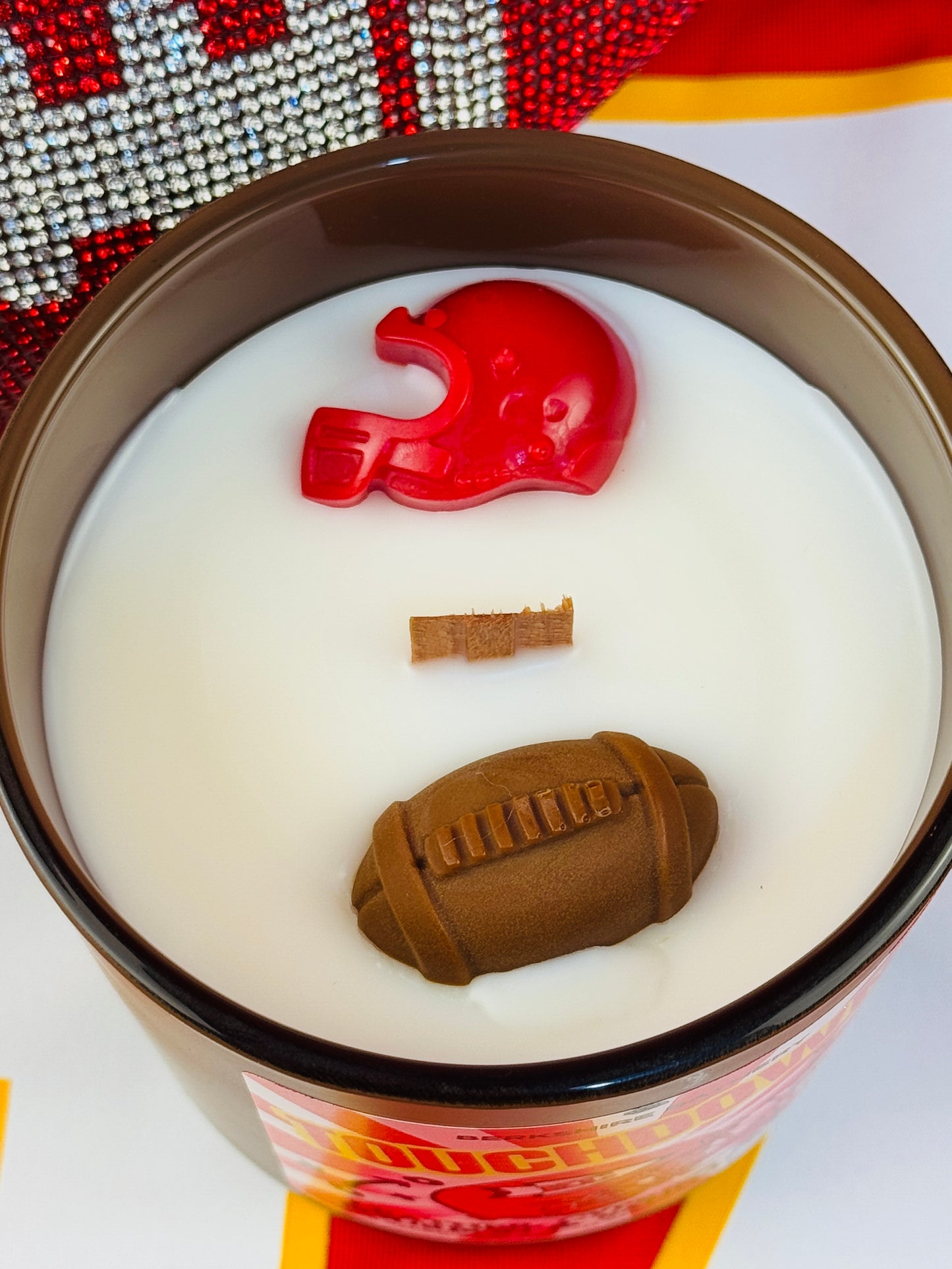 Matte football brown glass vessel displaying a celebratory football themed label (featuring my original artwork designed and printed by hand), creamy coconut olive oil soy wax nestled around an American-grown wooden wick that crackles like a fireplace!