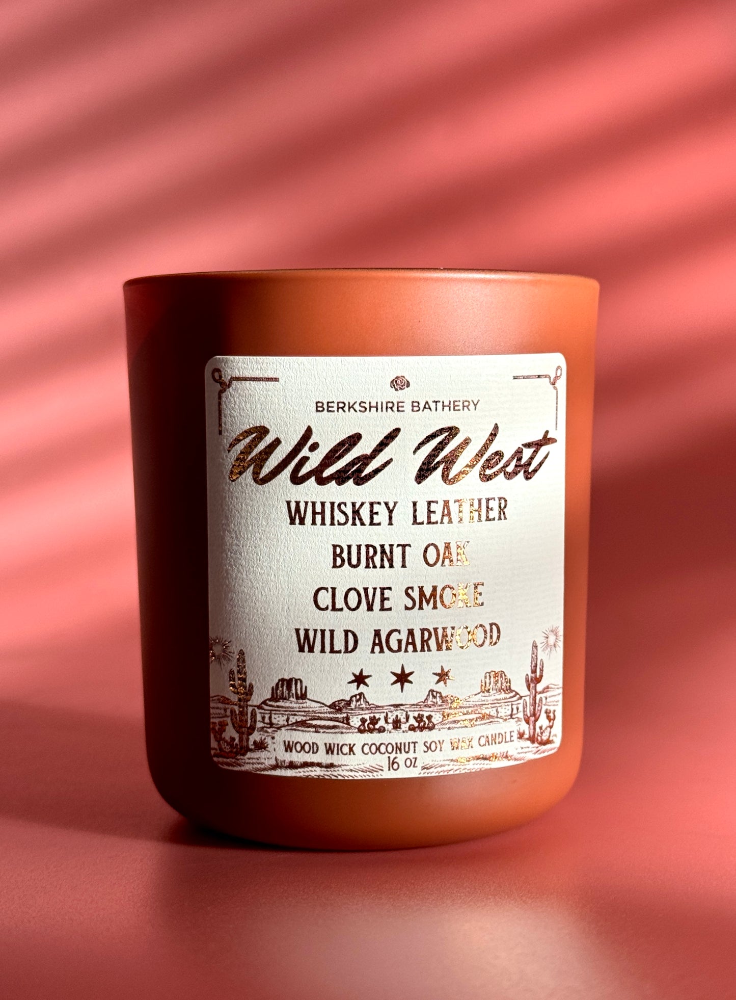 The old west: leathered saddles, sweet whiskey, dusty cowboy boots, smoked tobacco, burning campfire woods, spiced clove clouds, and the promise of gold 'round these parts.