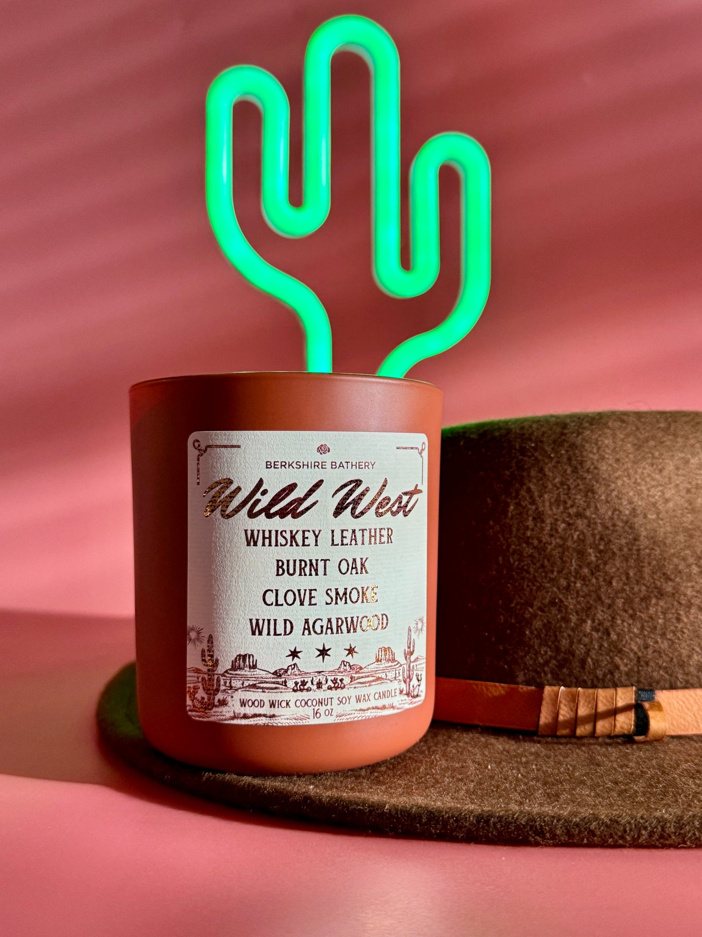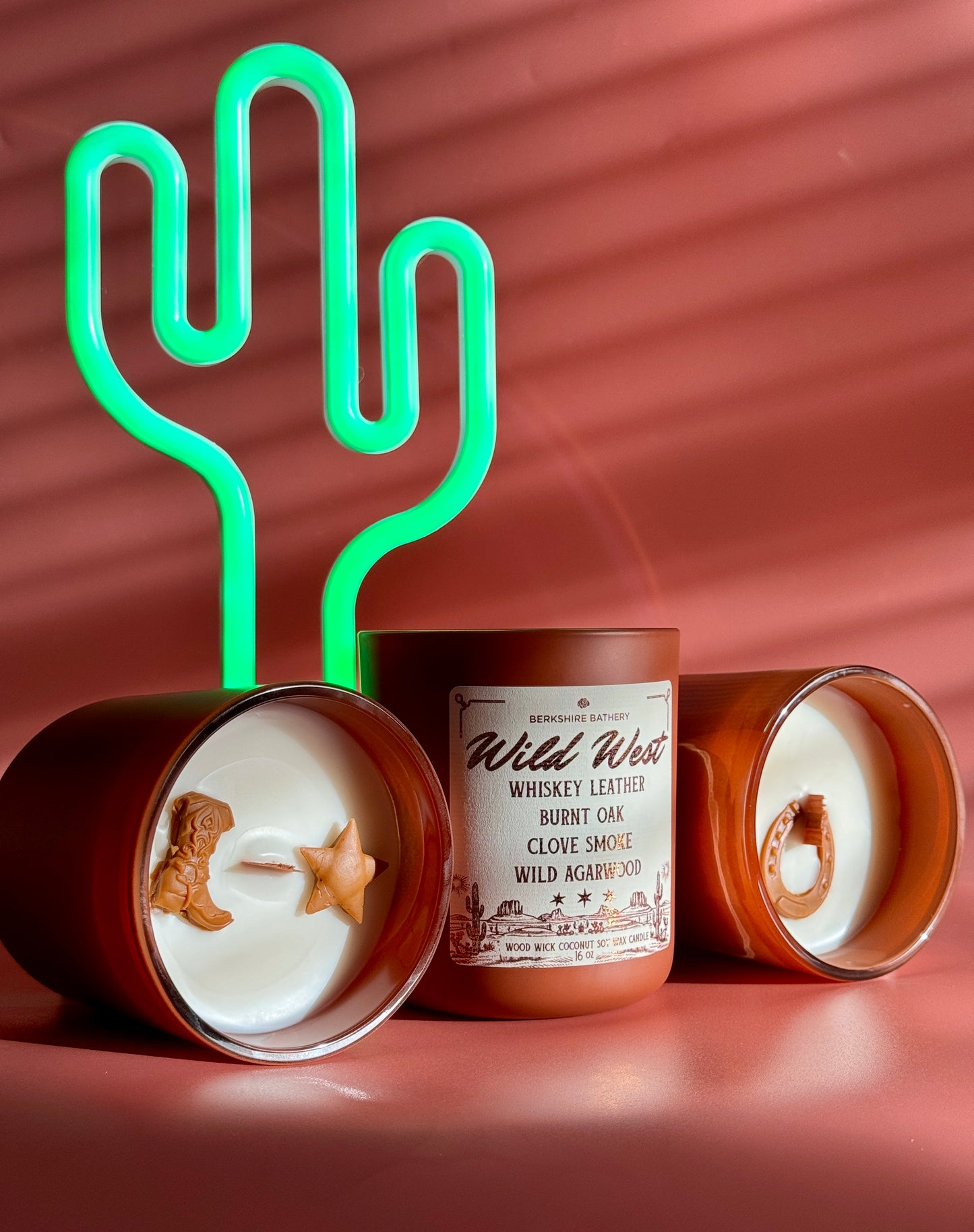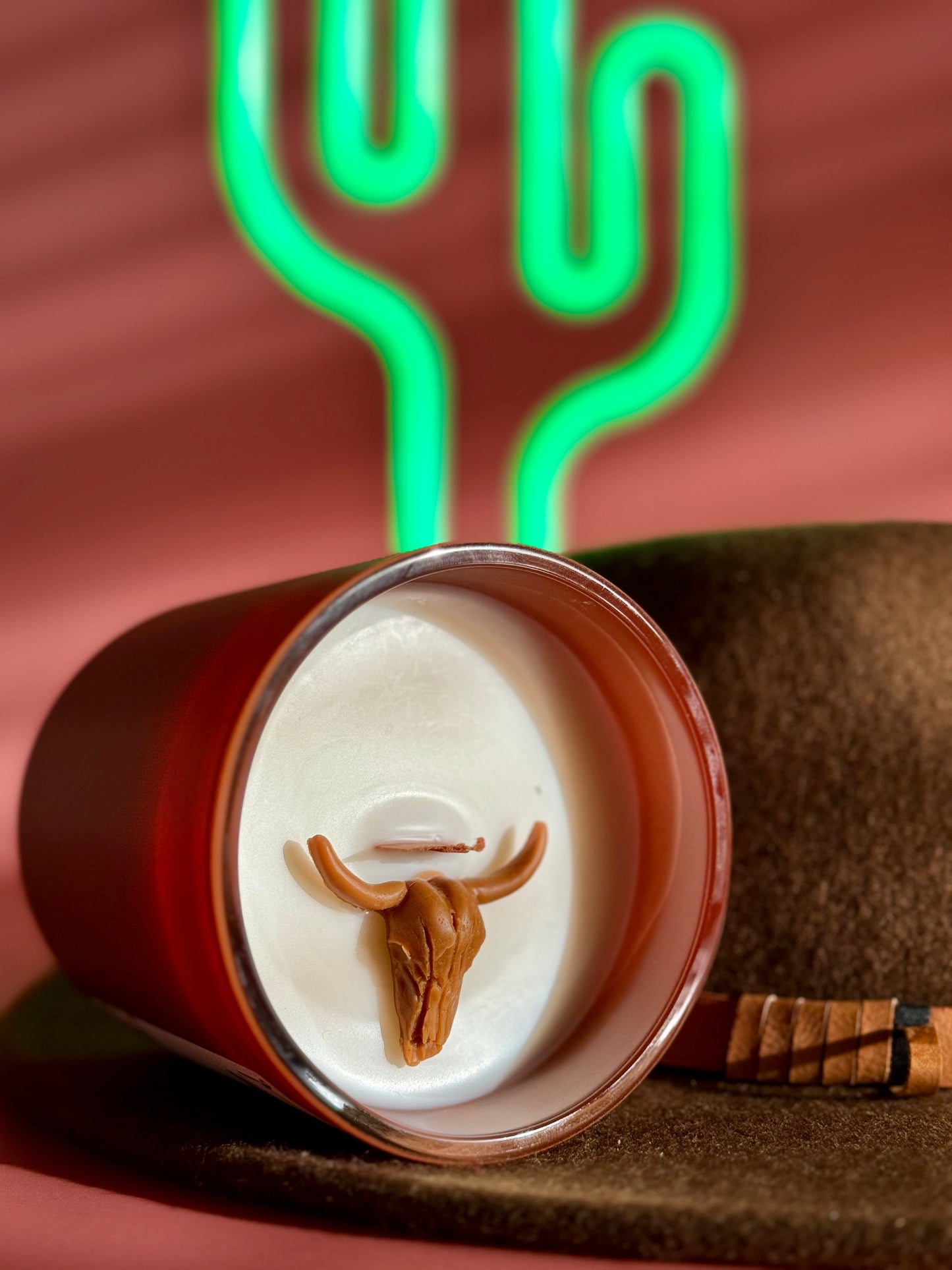 Saddle brown matte glass vessel displaying a shimmering copper textured vintage style label (designed and printed by hand), creamy coconut olive oil soy wax nestled around a crackling wooden wick, topped with a decorative scented wax icon of cowboy lore -- longhorn skull, horseshoe, cowboy boot, western star -- each a different design.