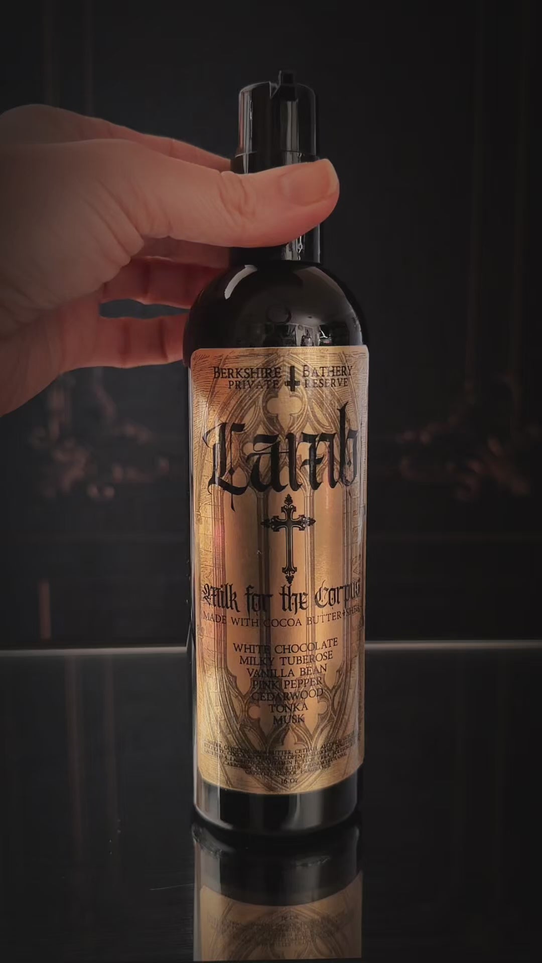 Black sixteen ounce bottle with black dispenser pump filled with creamy, not-too-thick body milk.