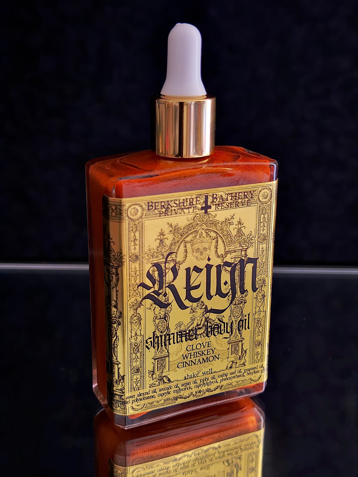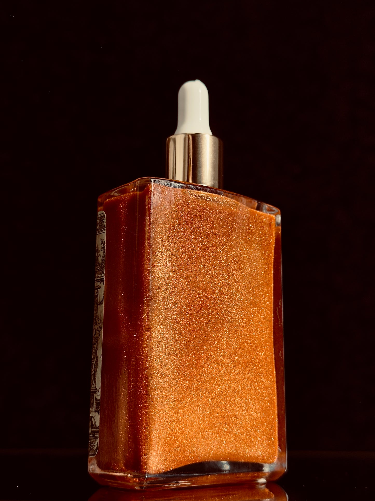 Clear square glass bottle with medicine dropper applicator lid filled with suspended copper colored mica for a sparkling, light-catching shimmering body oil.