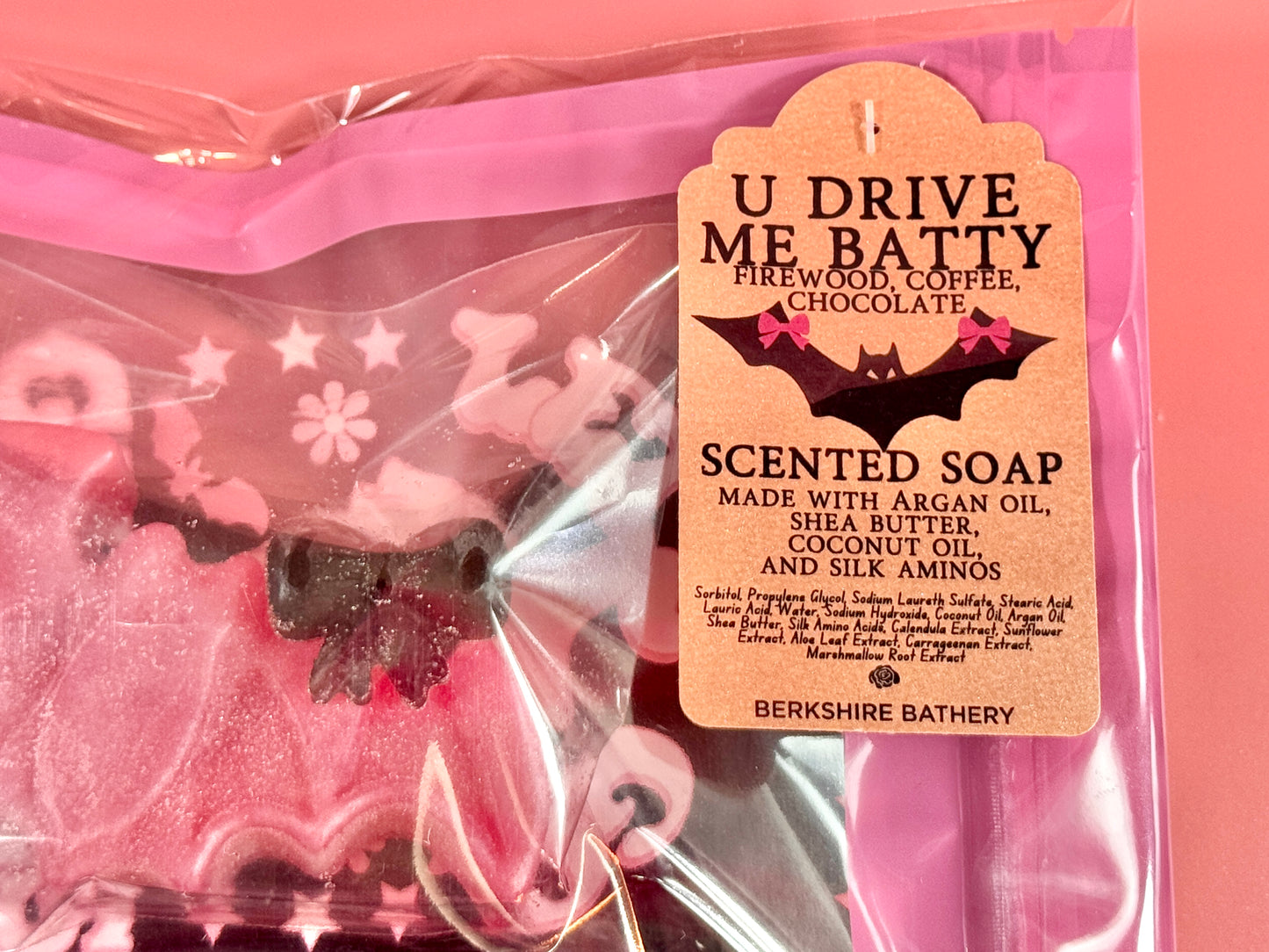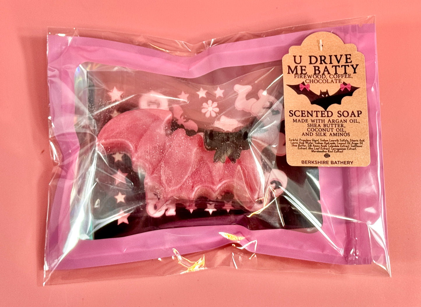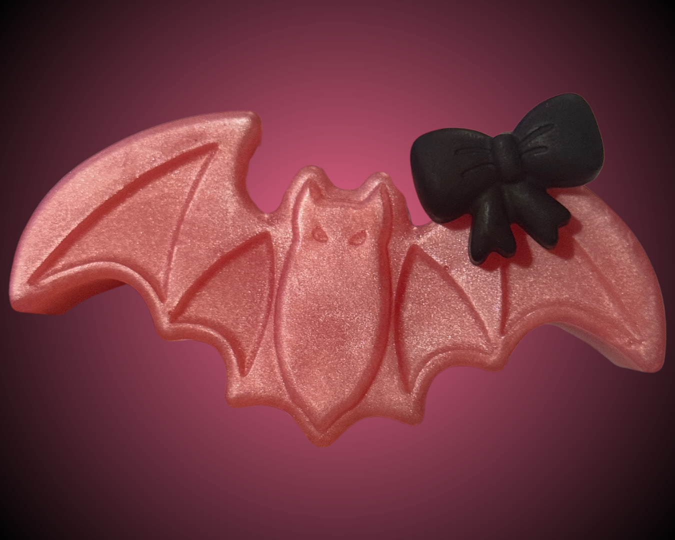 Looks like: Pastel pink bat with a black bow accent