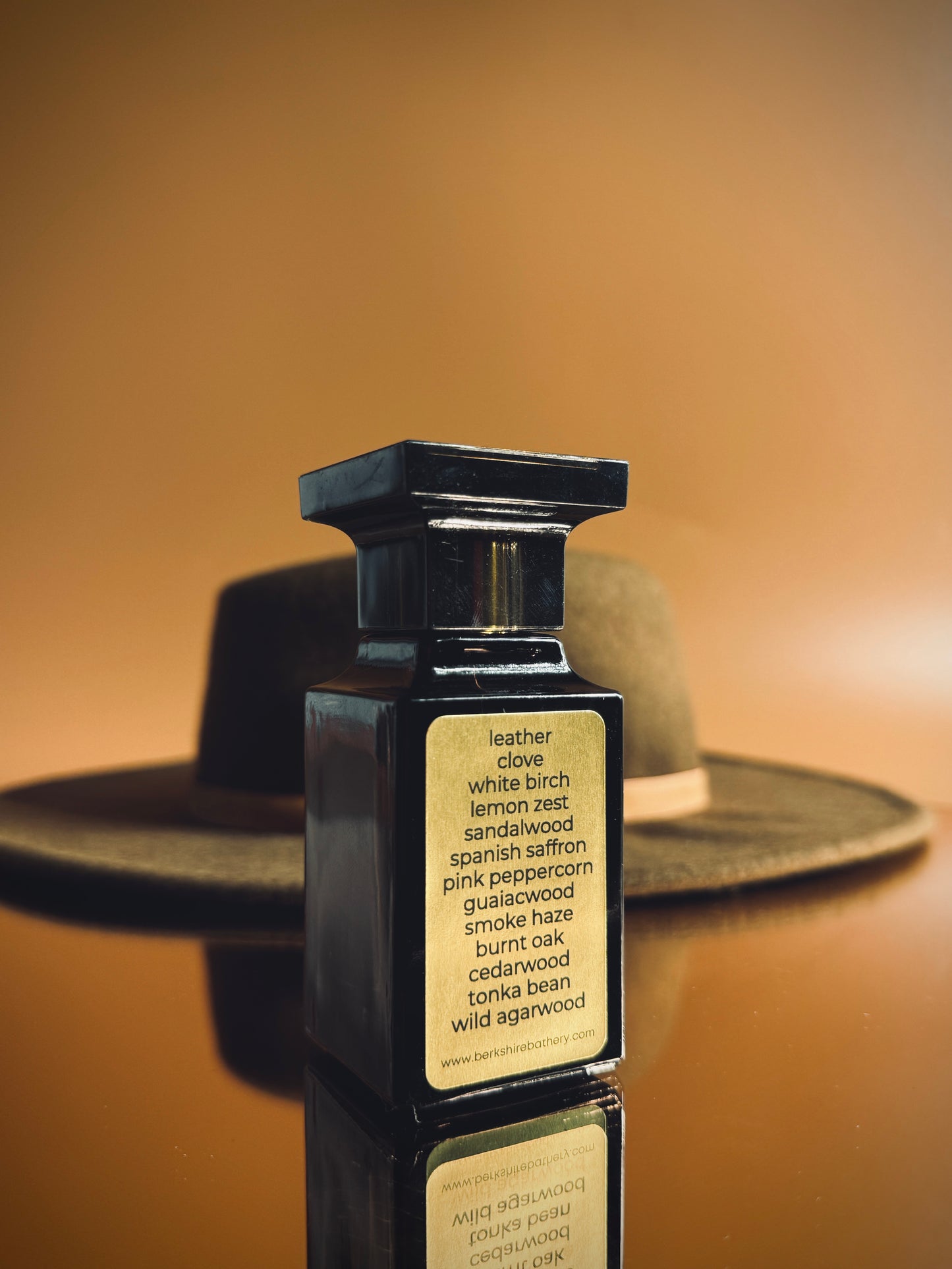 The masculine counterpart to Pink Suede, the yin to its yang, two sides of the same coin: leathered saddles, sweet whiskey, dusty cowboy boots, smoked tobacco, burning campfire woods, spiced clove clouds, and the promise of gold 'round these parts.