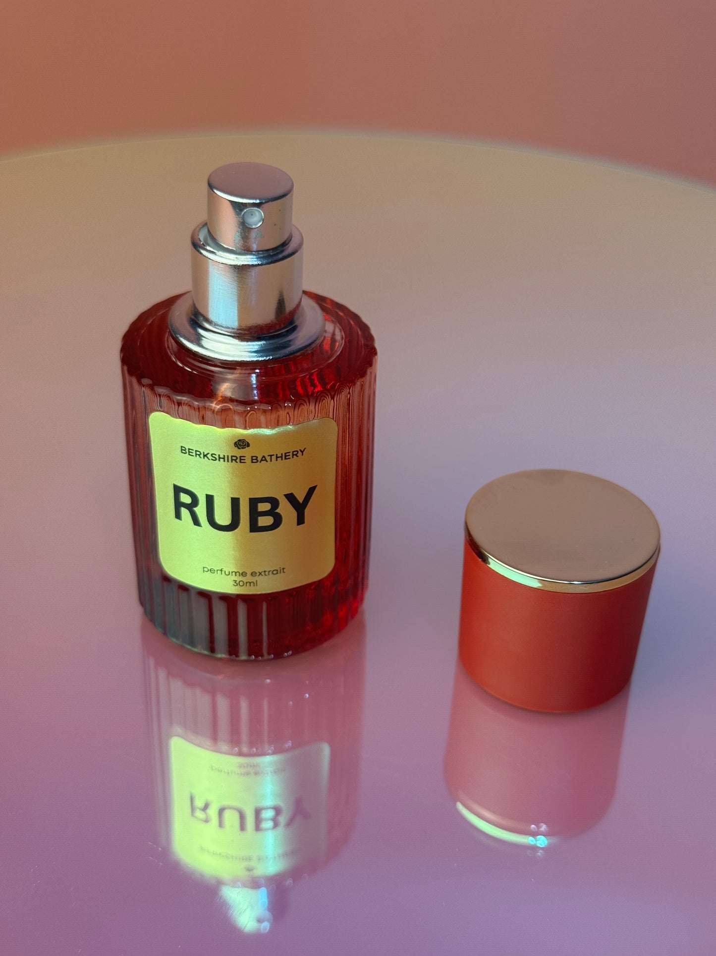 Translucent red glass bottle with matching metallic gold cap, fine mist spray applicator, and metallic gold label