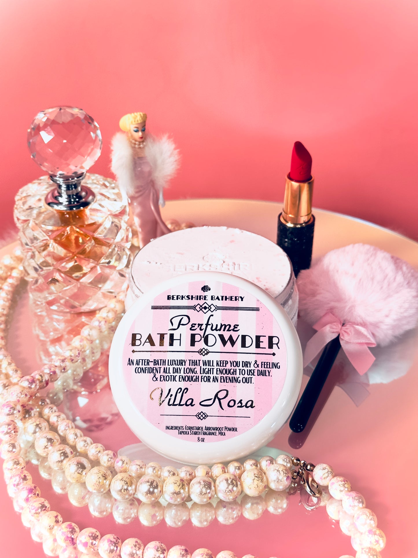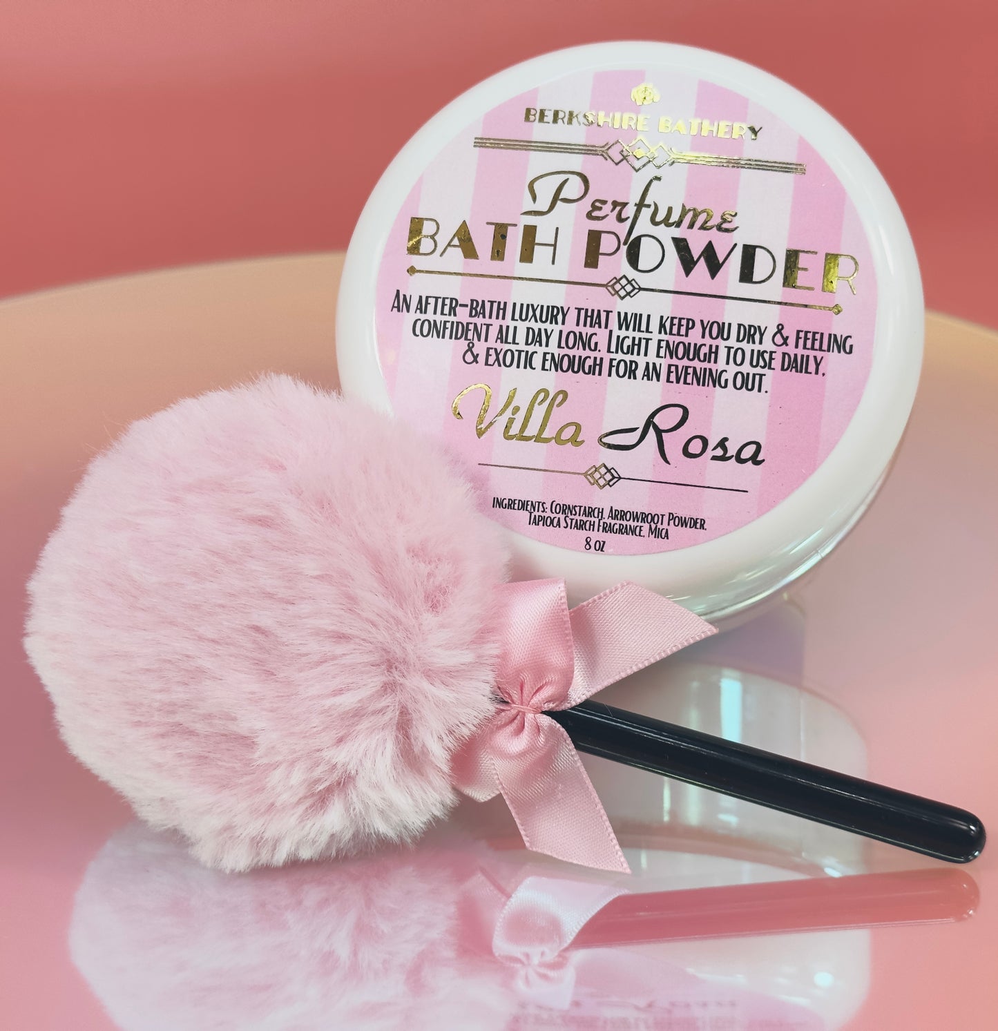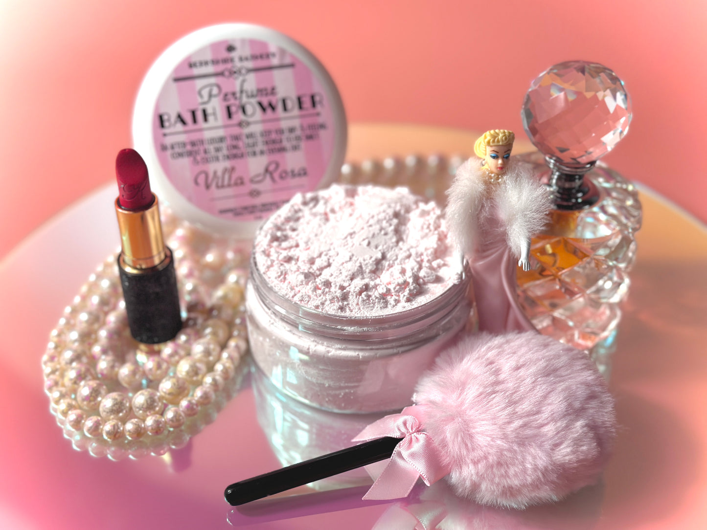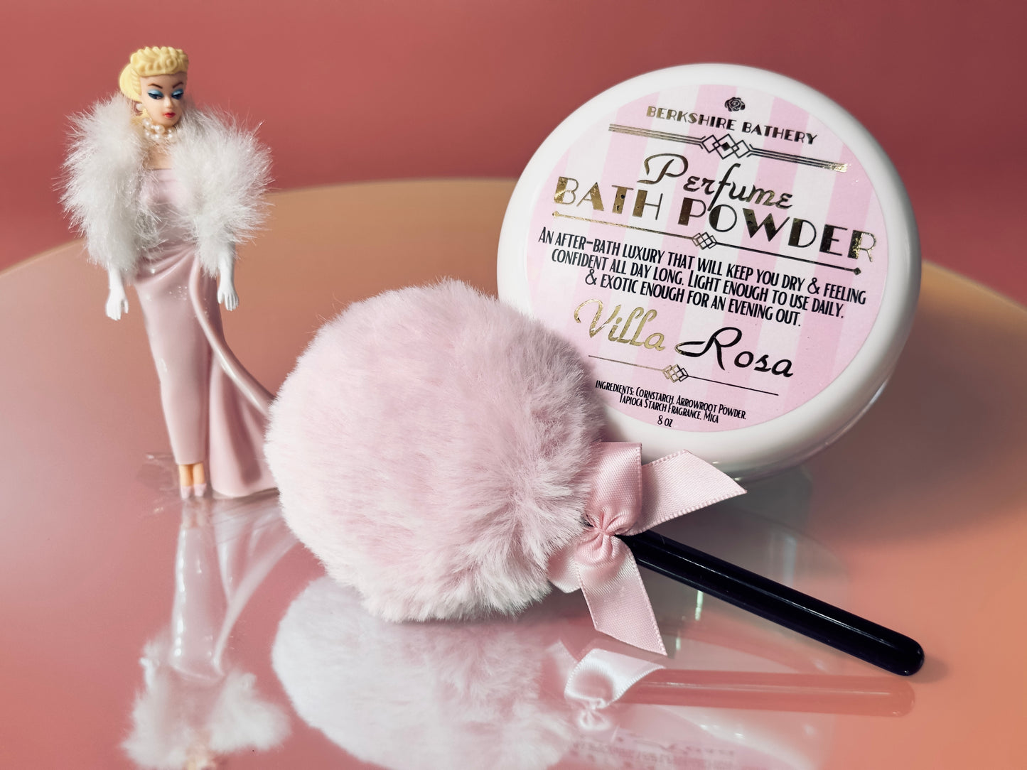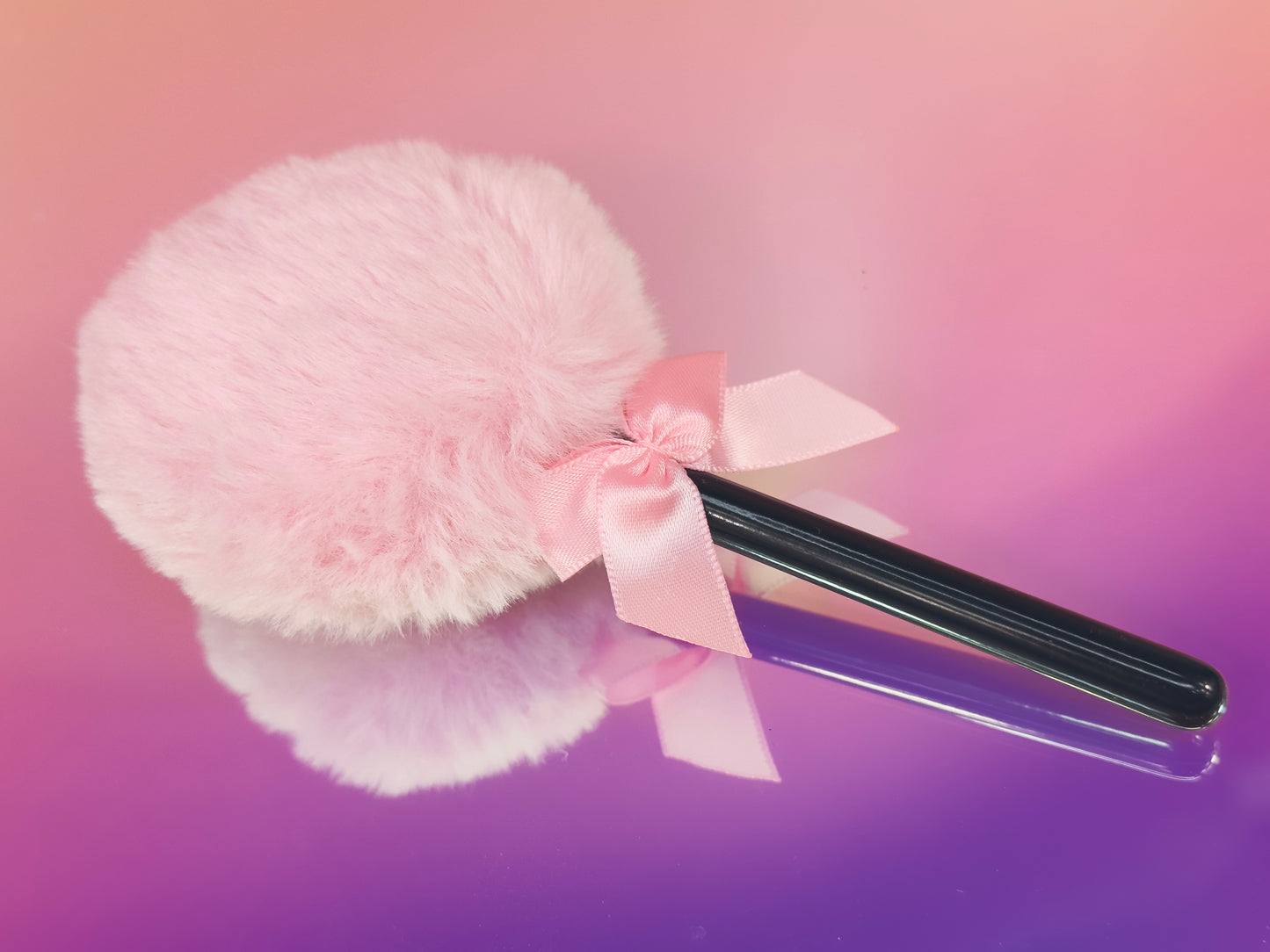Perfect for pretending to be a 1950s silver screen actress daintily applying her body powder, this luxurious wand features a vintage Barbie pink powder round puff atop a contrasting black handle, adorned with a gorgeous pink ribbon bow - all in an adorable lollipop shape.