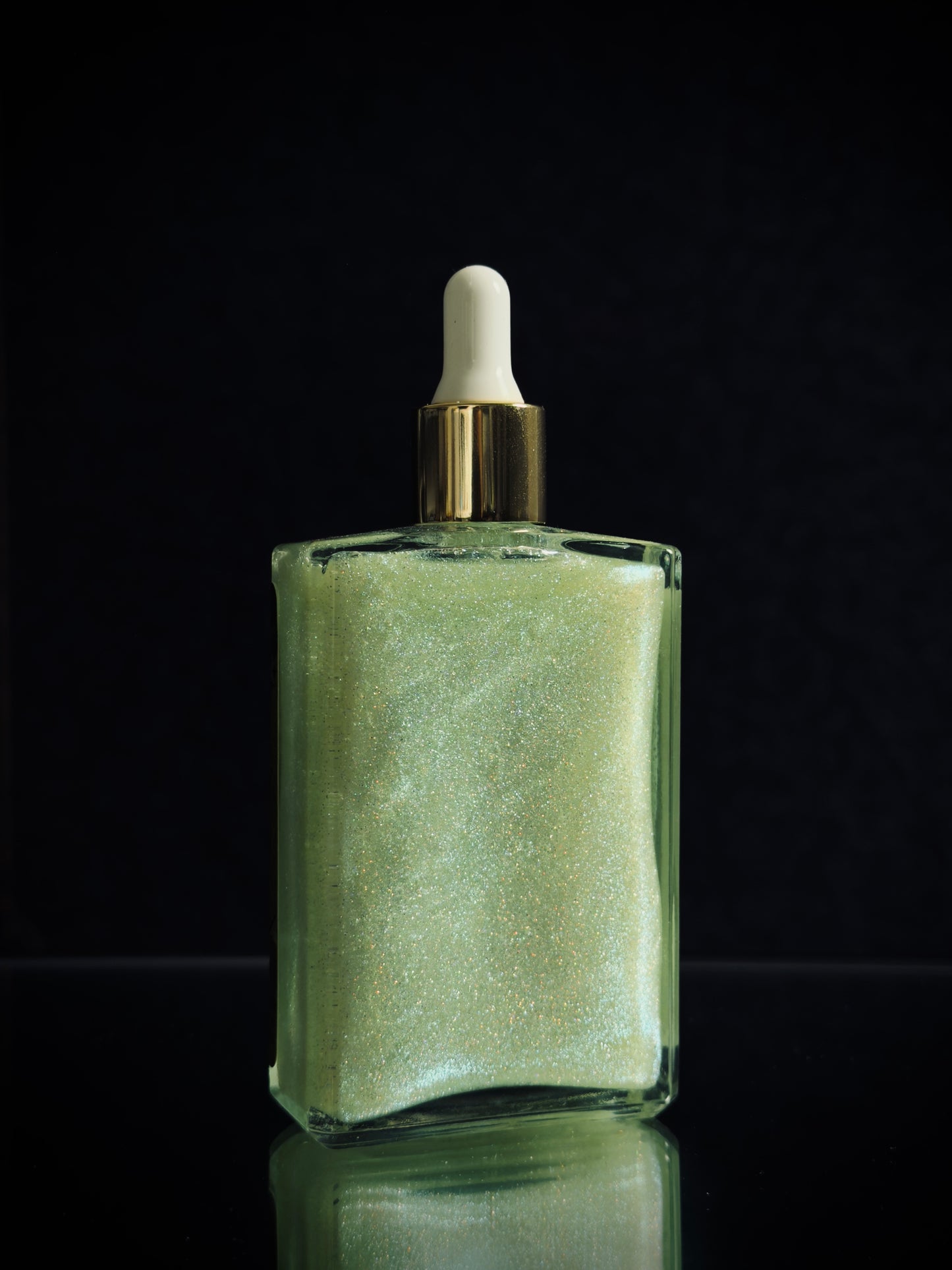 Clear square glass bottle with medicine dropper applicator lid filled with suspended iridescent and holographic nuclear-green colored mica for a sparkling, light-catching shimmering body oil.
