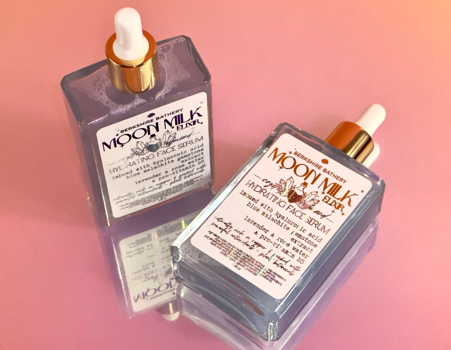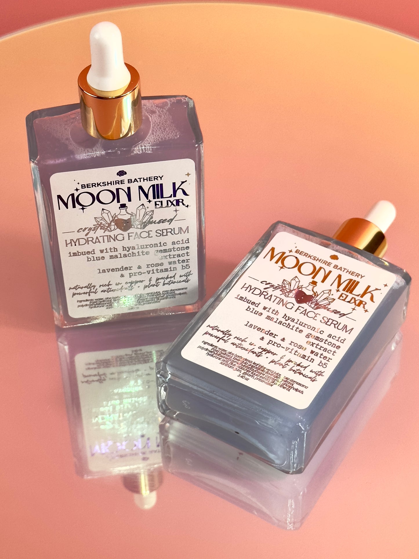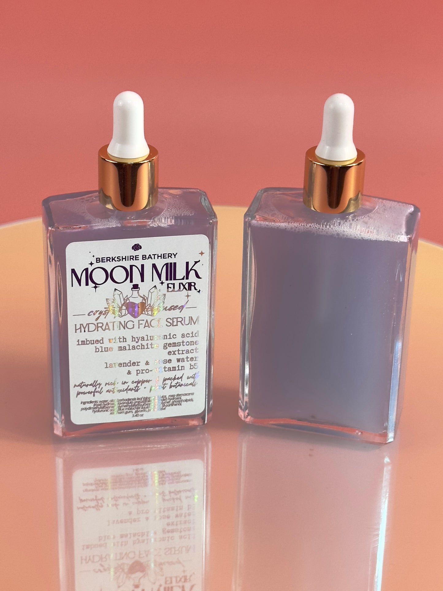 Presenting my very first face serum, Moon Milk Elixir! Naturally rich in copper & packed with powerful antioxidants and plant botanicals, this serum is imbued with hyaluronic acid blue malachite gemstone extract, lavender & rose water & pro-vitamin b5!