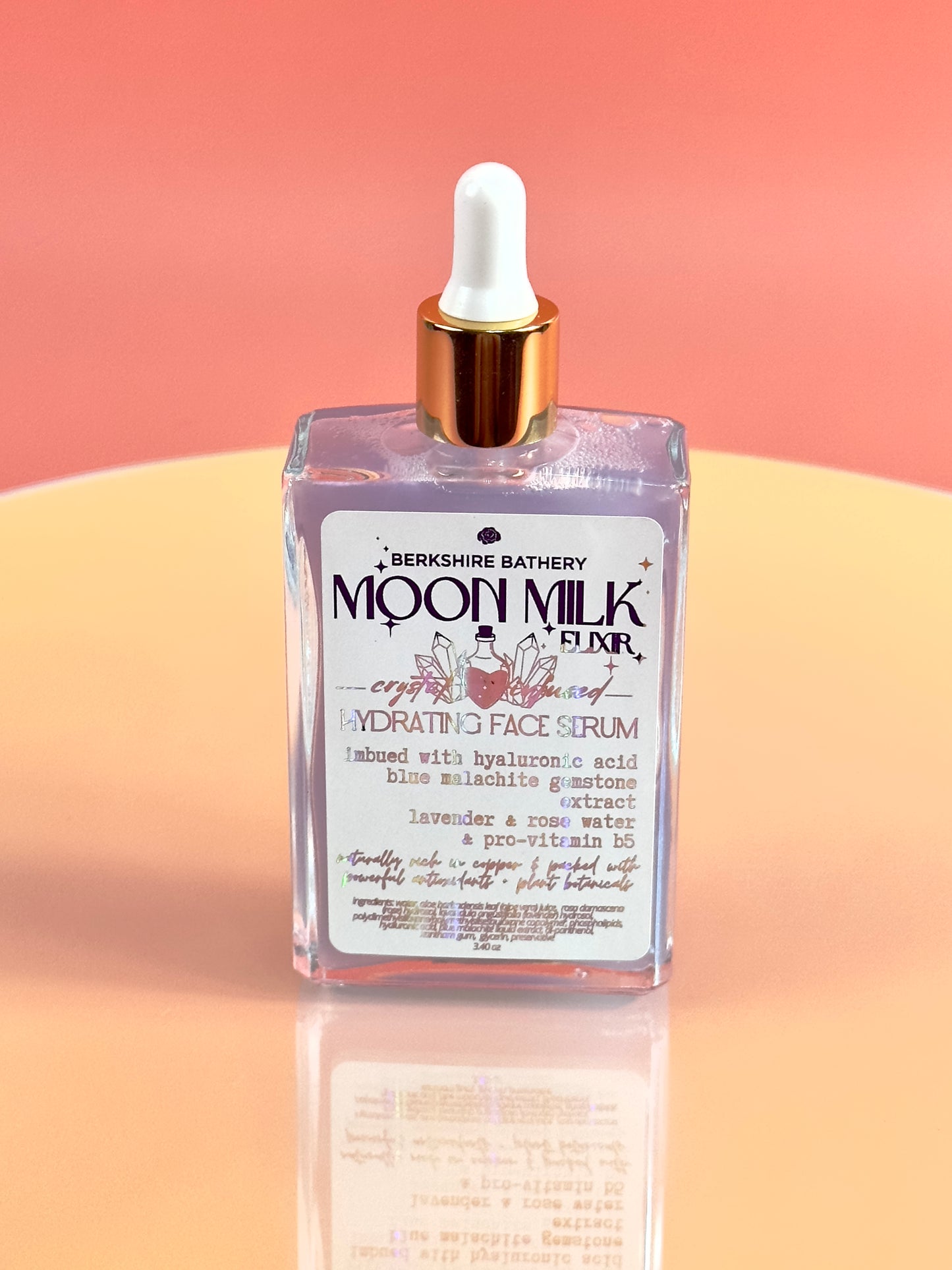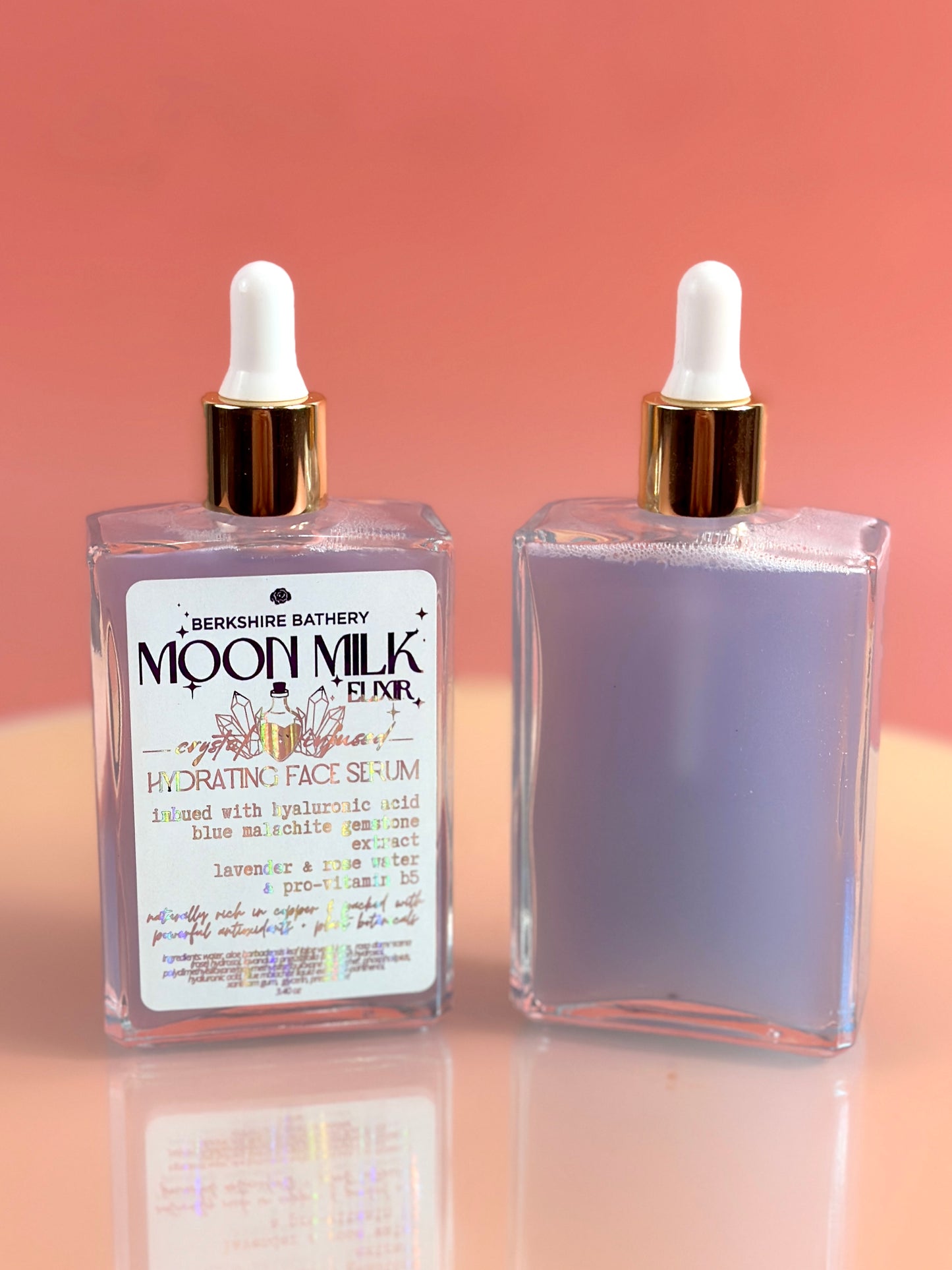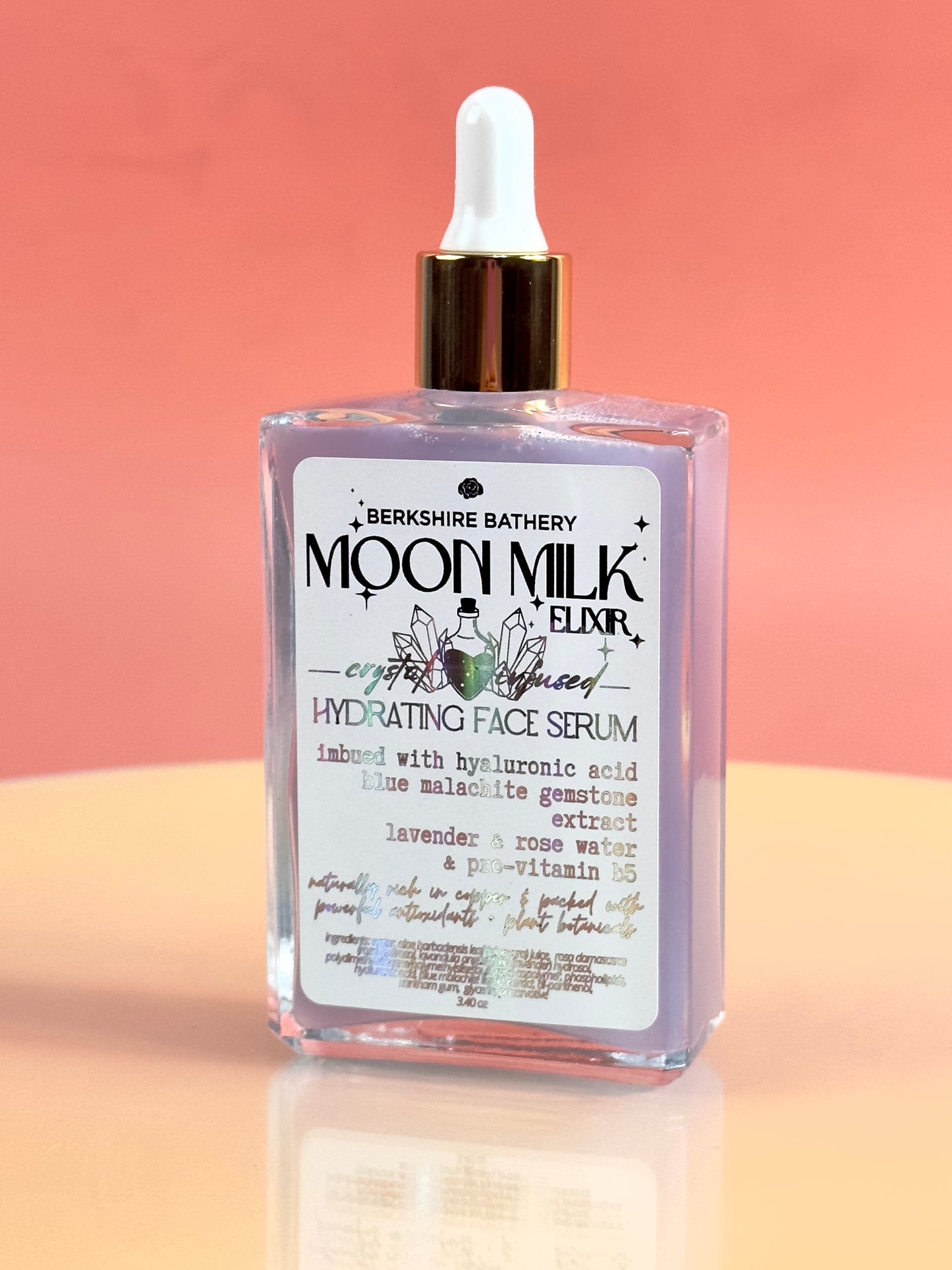 Presenting my very first face serum, Moon Milk Elixir! Naturally rich in copper & packed with powerful antioxidants and plant botanicals, this serum is imbued with hyaluronic acid blue malachite gemstone extract, lavender & rose water & pro-vitamin b5!