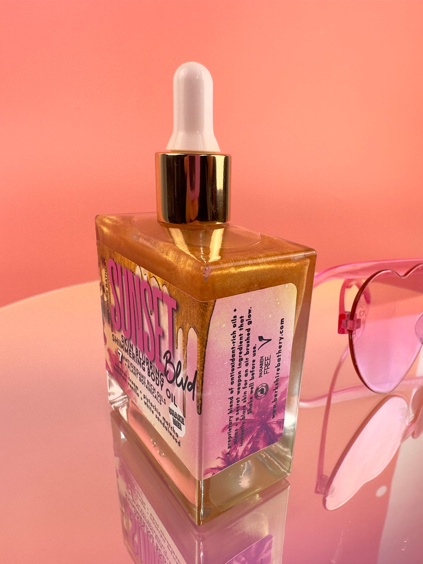 Looks like: Clear square glass bottle with medicine dropper applicator lid filled with dazzling, mesmerizing, shimmering body oil