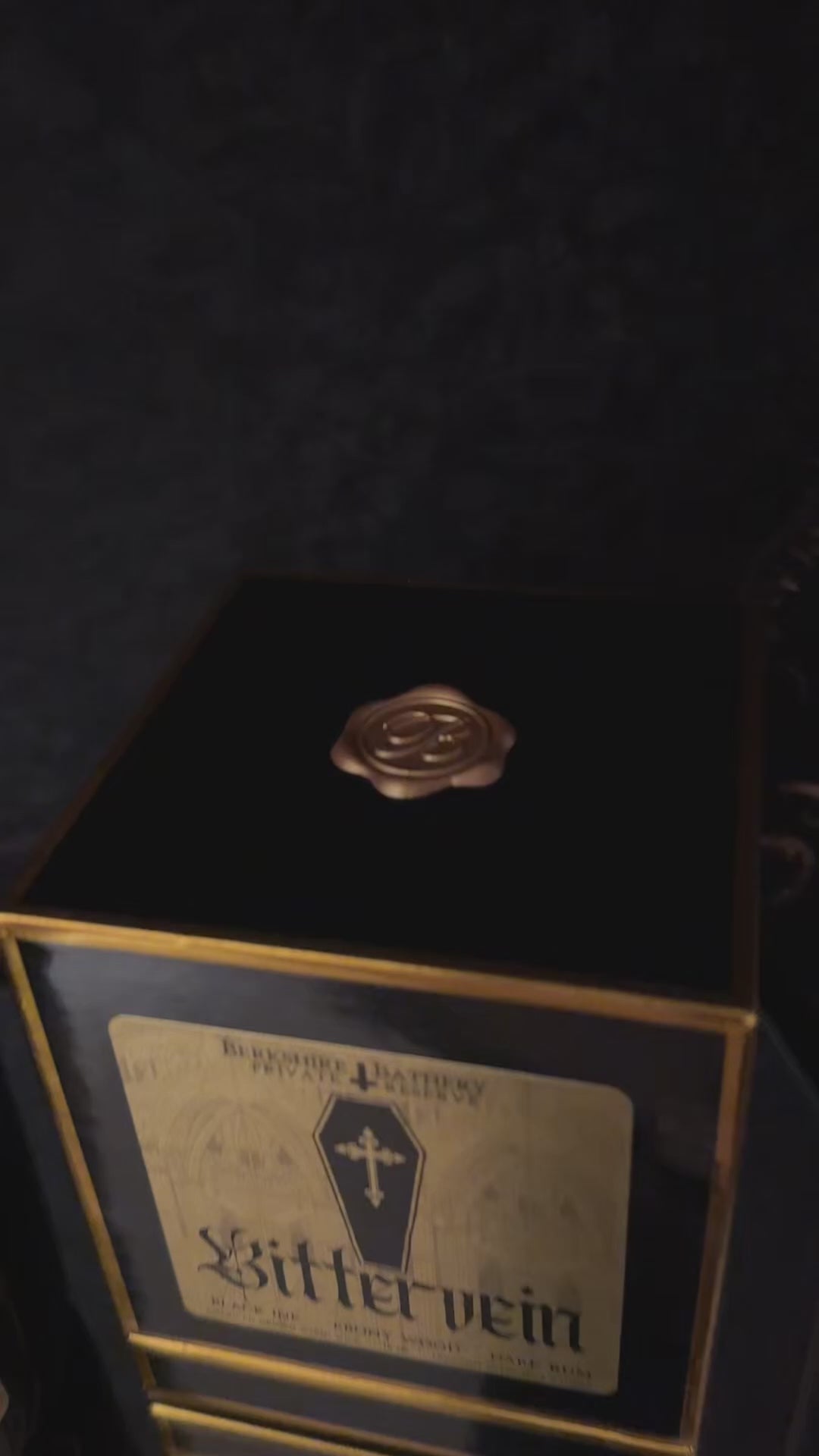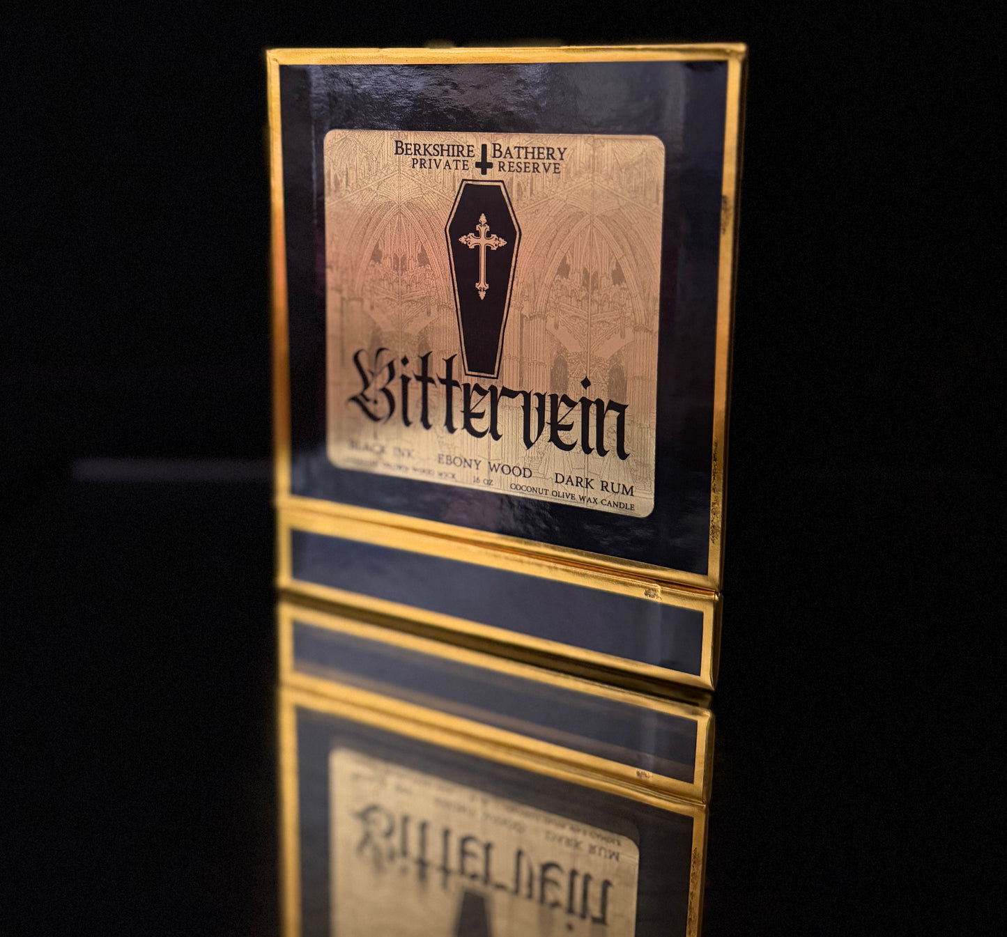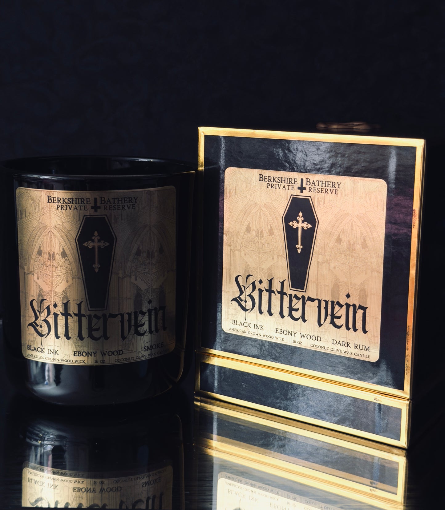 Glossy black glass vessel displaying a gold metallic label (featuring my original gothic artwork designed and printed by hand), creamy coconut olive oil soy wax nestled around a crackling American-grown wooden wick. Comes in a matching black and gold gift two-piece nested box for maximum opulence -- perfect for gift giving.