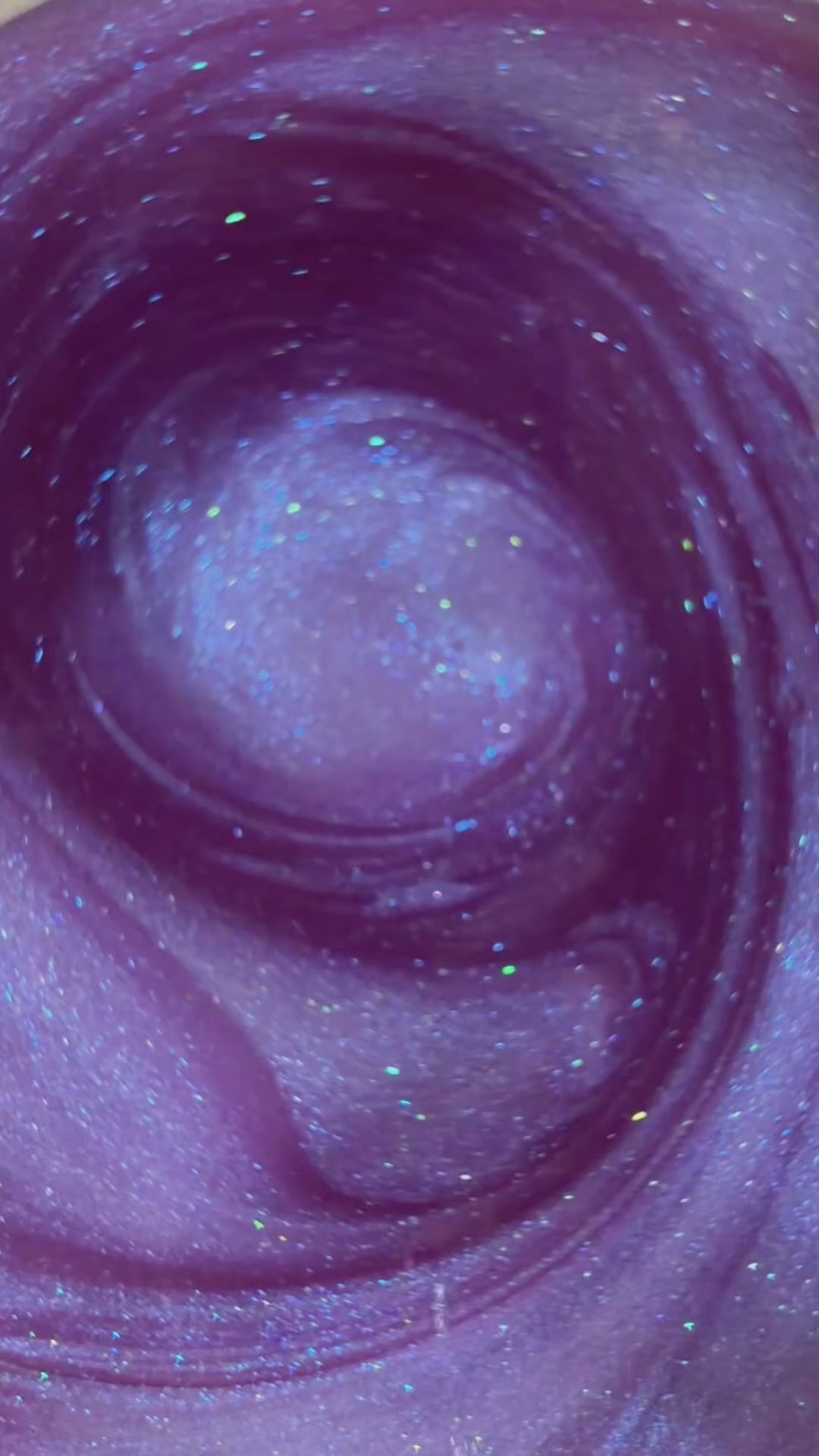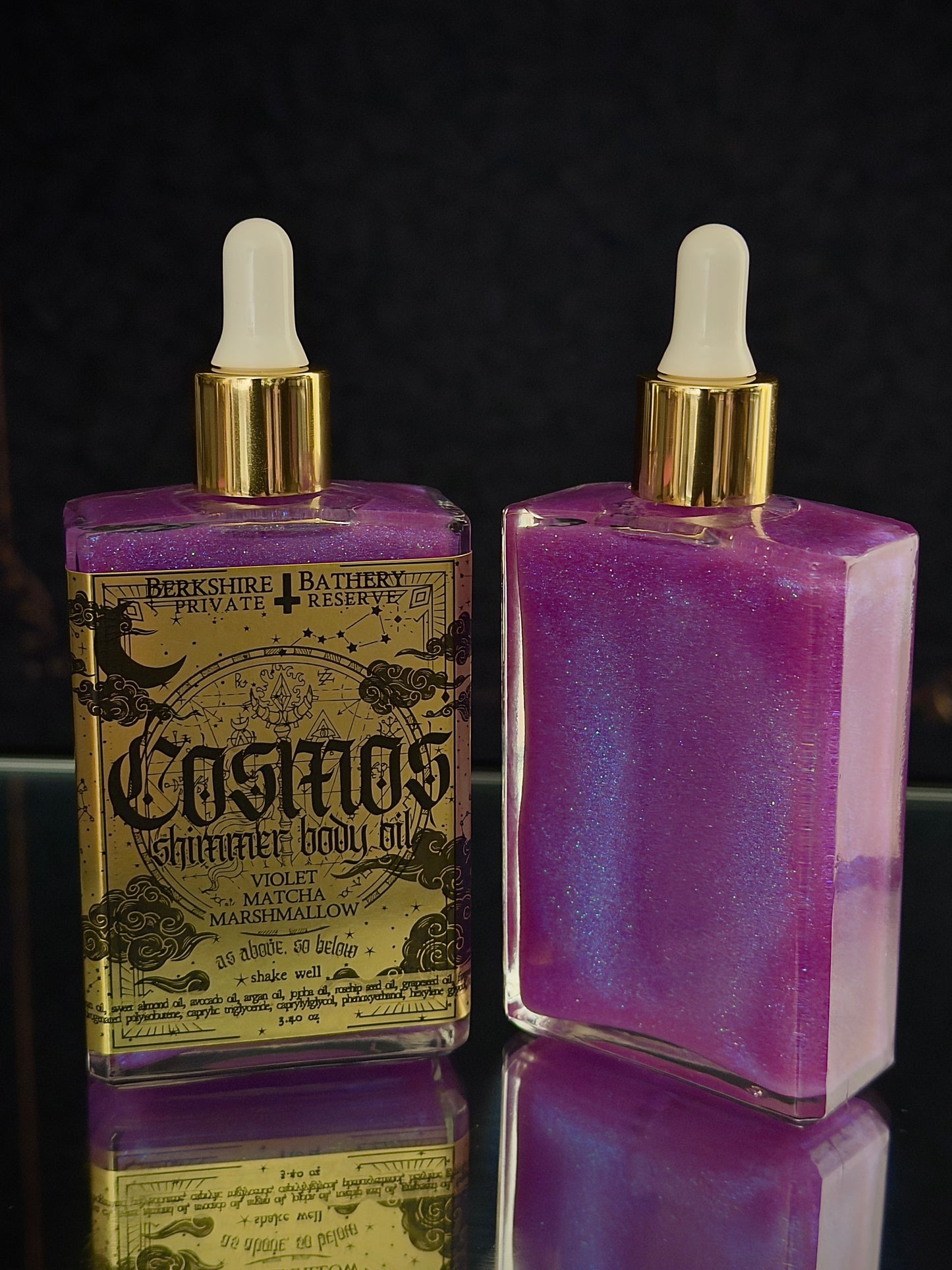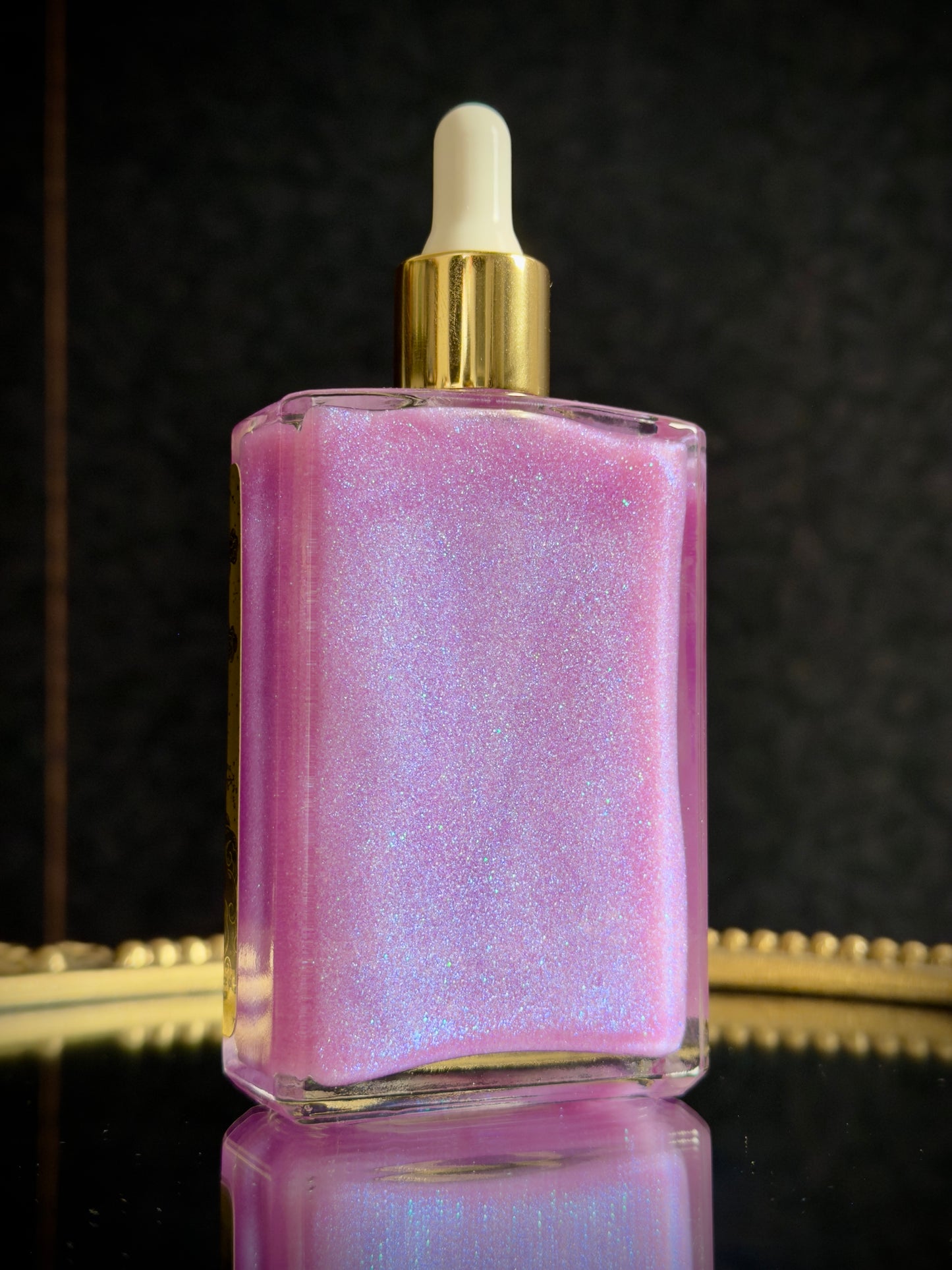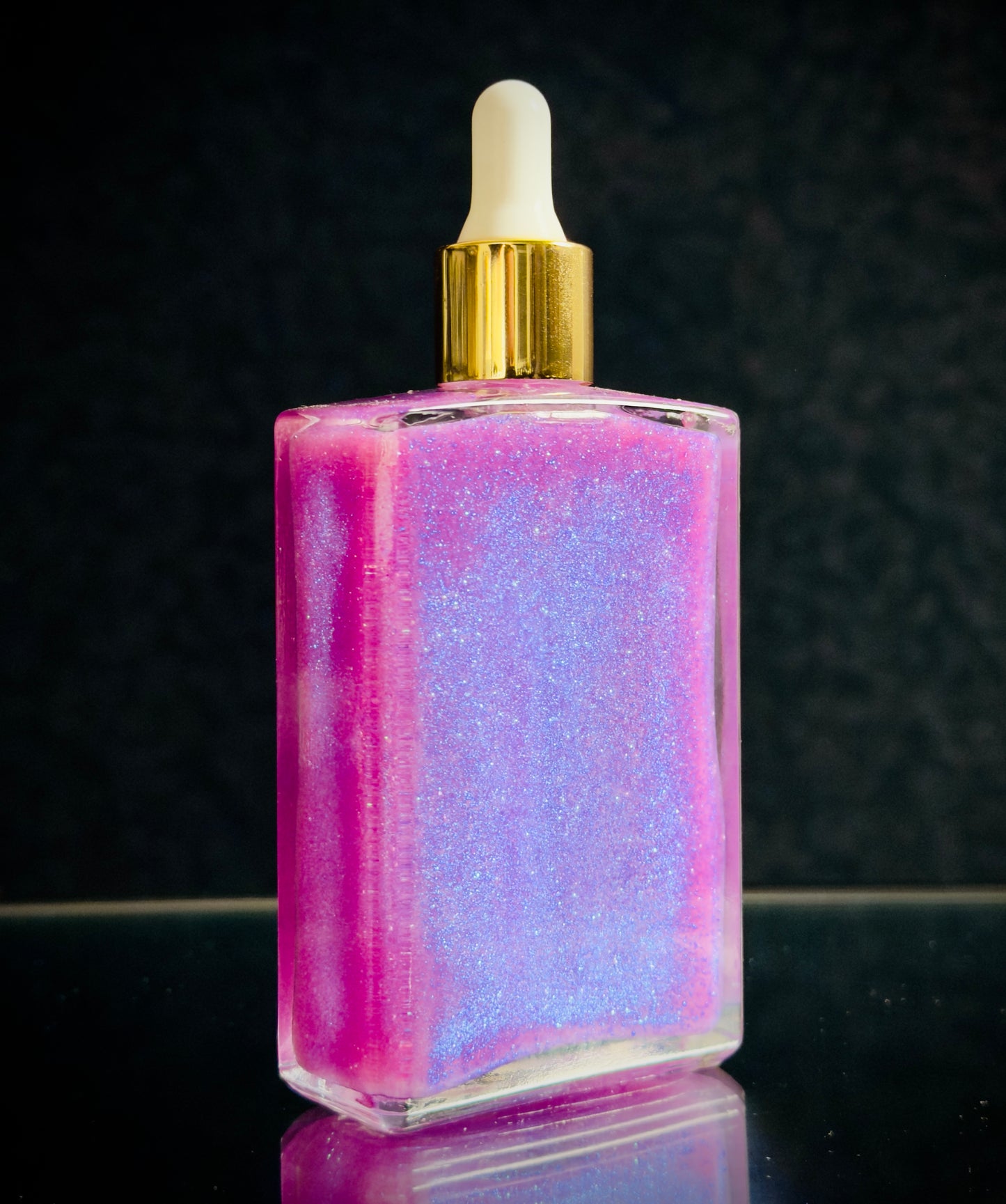 Clear square glass bottle with medicine dropper applicator lid filled with suspended iridescent + holographic purple colored mica for a light-catching shimmering body oil.